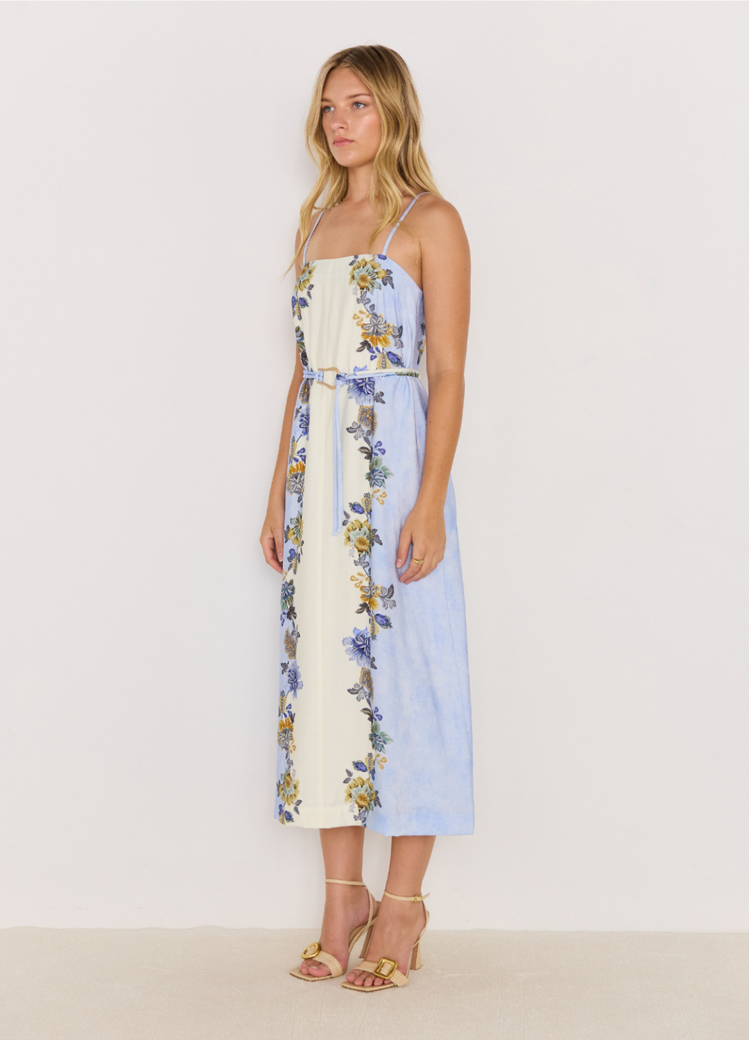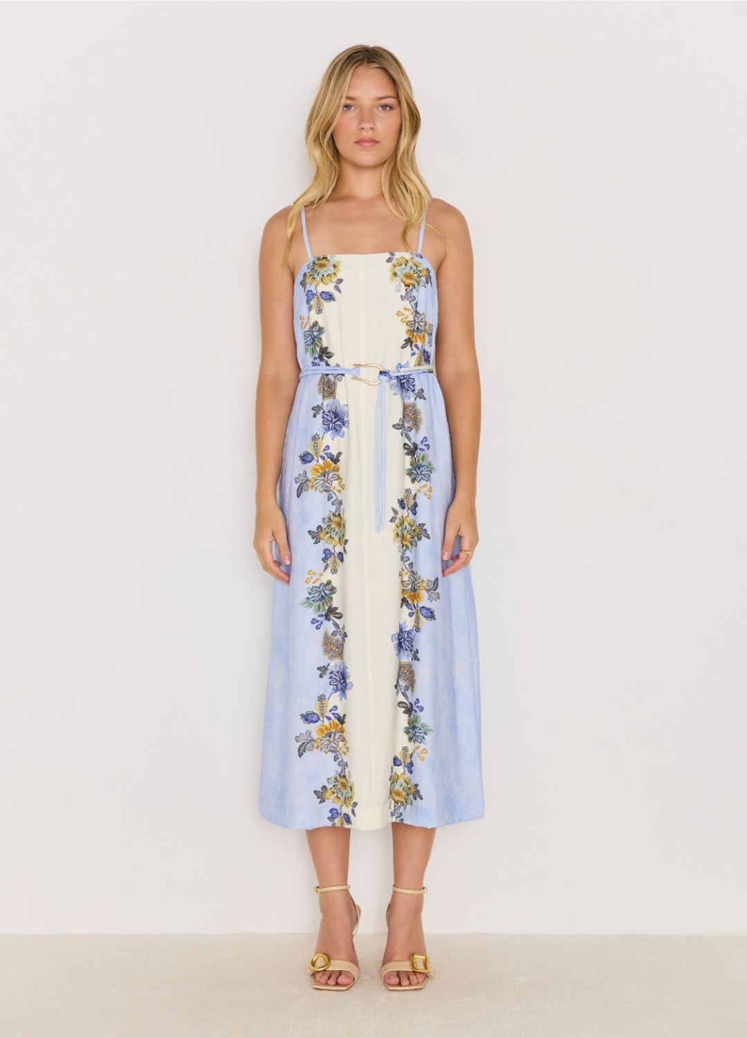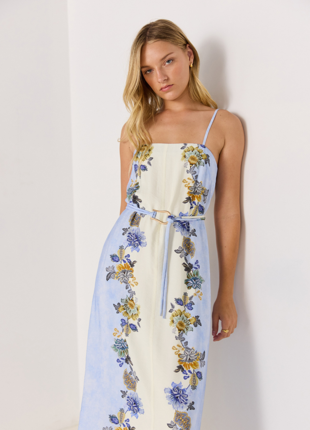 The Lucia Blue & Cream Floral Midi Dress is a breezy, romantic style made for sunny days and balmy nights. Featuring a watercolour blue and cream base with vibrant floral prints, it’s designed with slim spaghetti straps, a square neckline, and a detachable belt to define the waist. The flowing midi skirt adds an effortlessly elegant touch, perfect for garden parties or seaside escapes.
