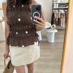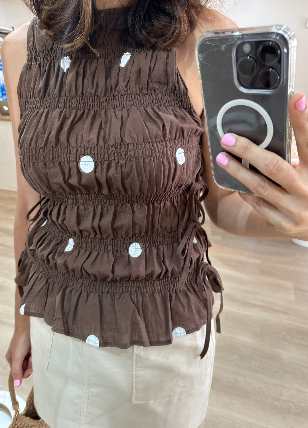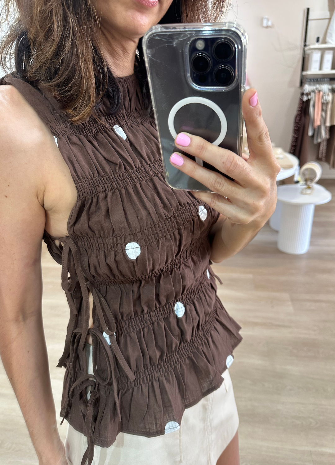 Sweet and stylish, this chocolate brown polka dot top is designed with flattering rouched detailing and an adjustable side ties for the perfect fit. Made from 100% breathable cotton, it's soft, lightweight, and ideal for effortless everyday wear.