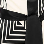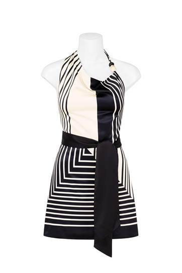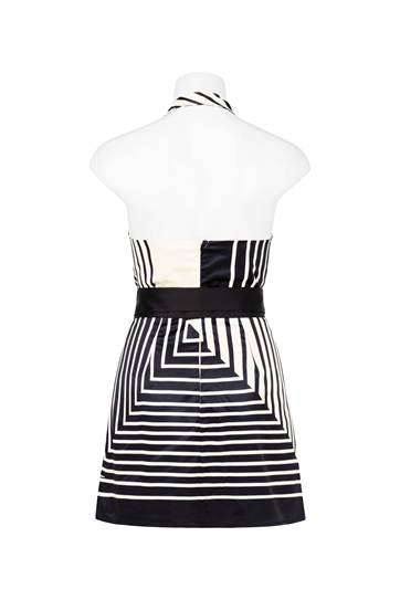 A halter mini dress with delicate beaded neckline and striking geometric pattern. This dress falls above the knee, giving it a short and playful silhouette. Wraps around the neck, leaving the shoulders and most of the back bare. The dress has a tailored fit that accentuates the waistline. Completed with an invisible back zipper, it is created with 100% Polyester for a neat apperance.
