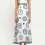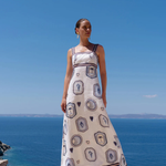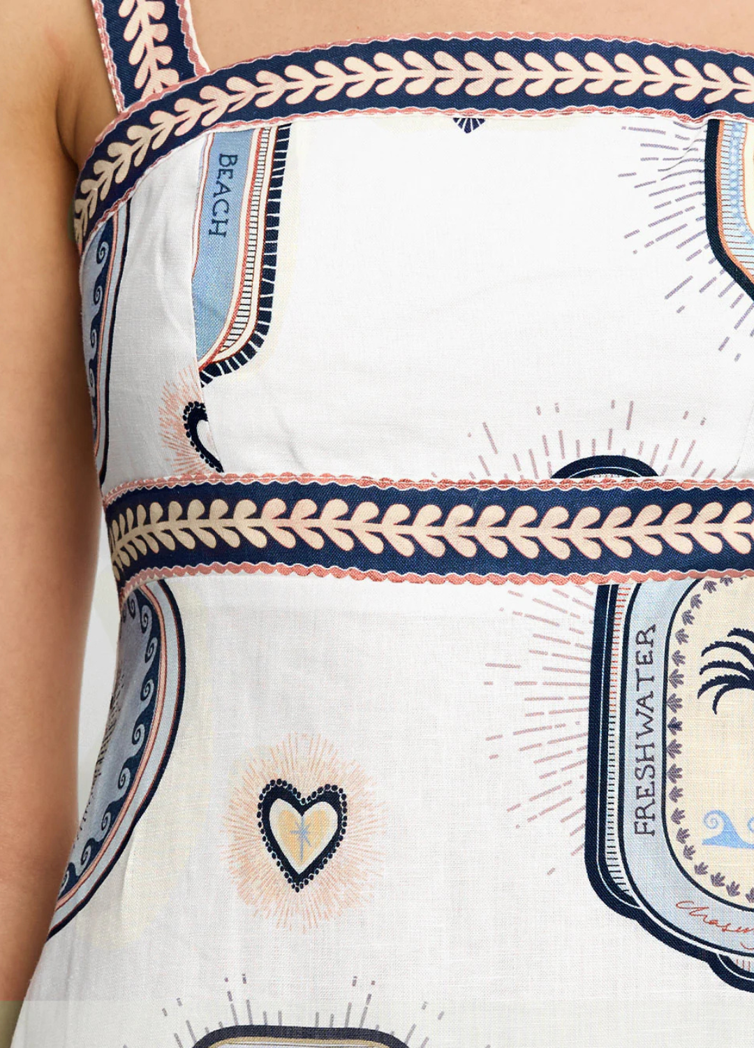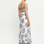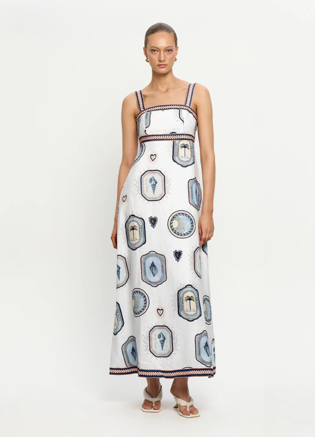 Alessia is vintage-inspired coastal medallions, shell motifs and palm emblems in soft blue and sand tones, creating a nostalgic print with an effortless seaside charm. The Alessia Maxi Dress features a classic square neckline with adjustable straps, a softly fitted bodice and a relaxed skirt, finished with contrast trim detailing throughout. Perfect for long lunches, destination evenings or sun-soaked celebrations by the water.