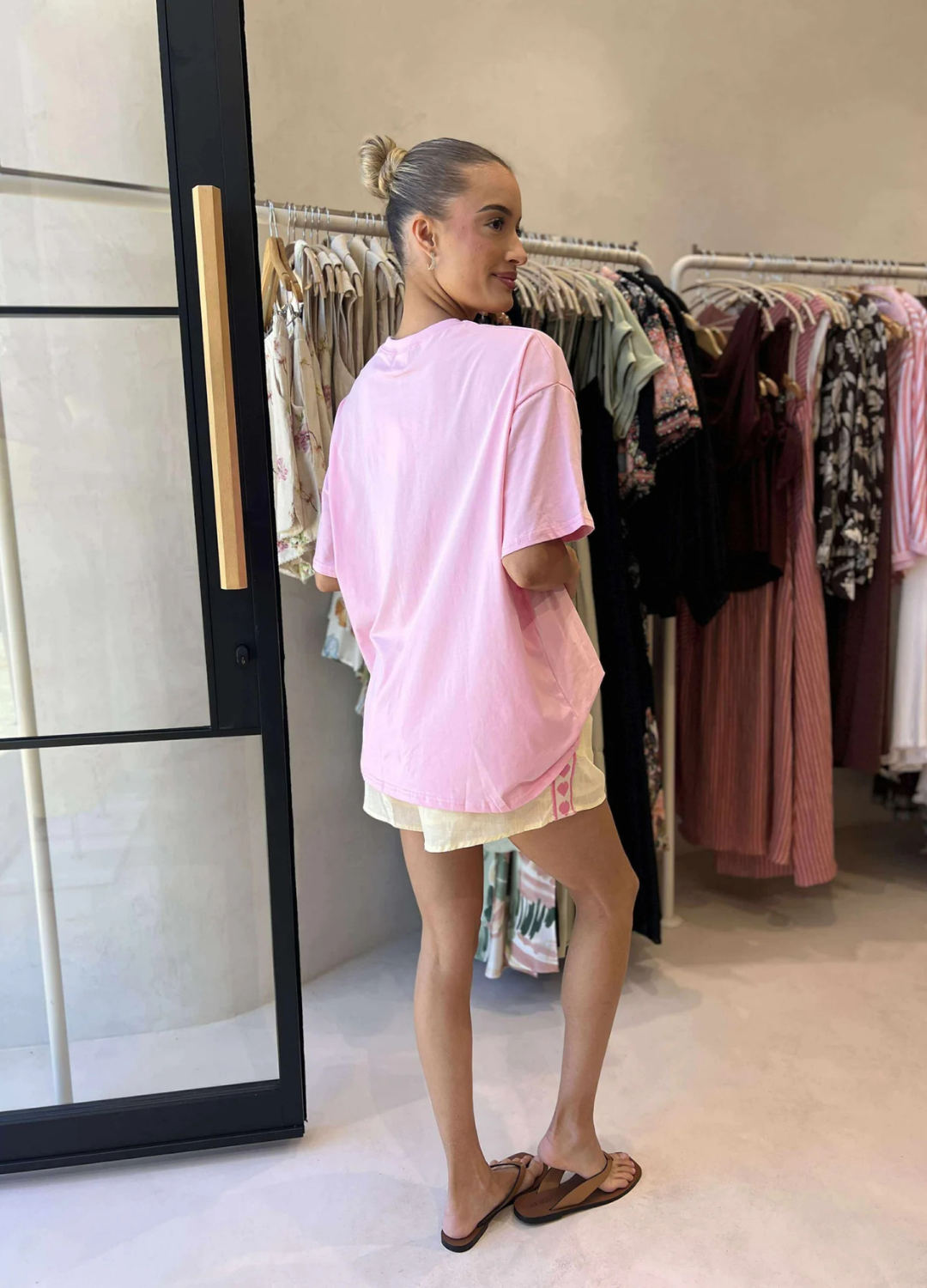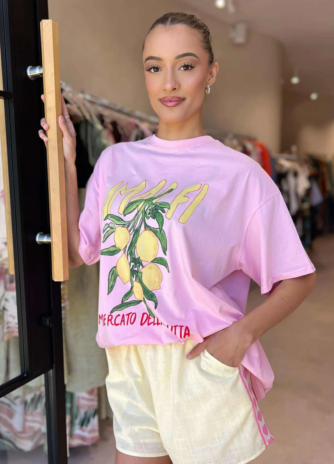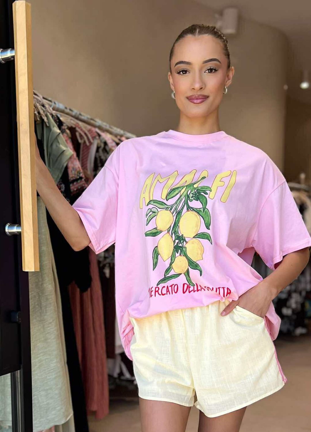 Radiate sunshine wherever you go in this cheerful pink and yellow short and shirt set. The relaxed-fit pink shirt showcases an Amalfi Coast inspired graphic for laid back summer style.