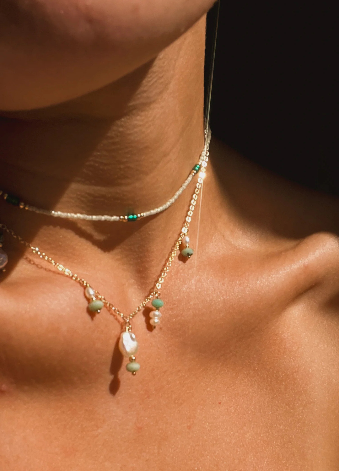 A candid arrangement of sea glass beads and freshwater pearls offering a unique adornment of shimmering blue hues.