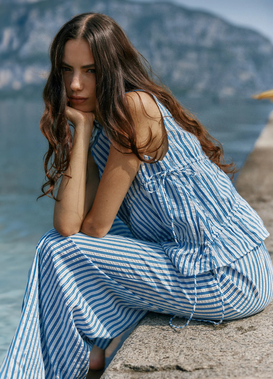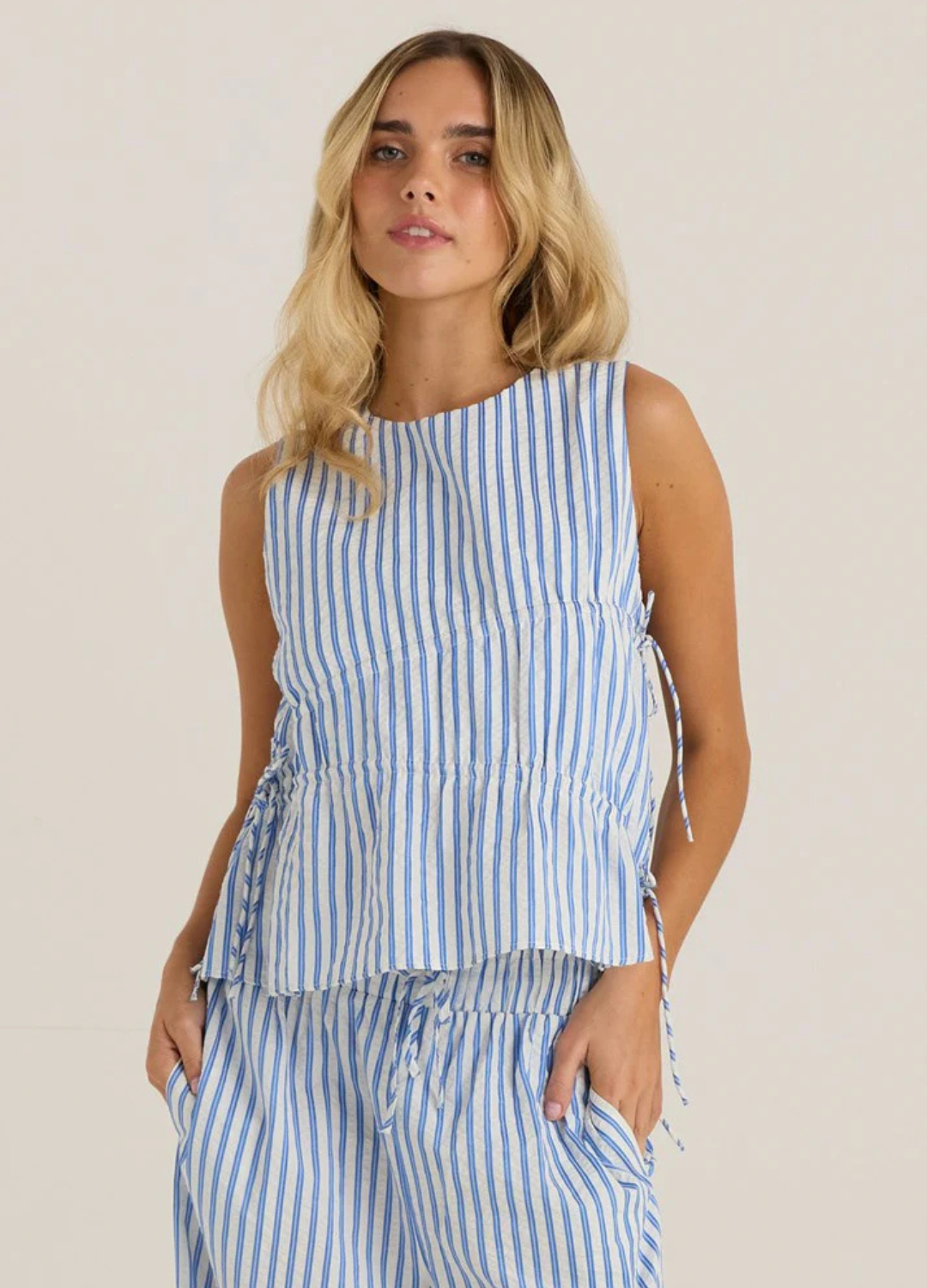 Aziza Gathered Tie Top (Blue/White Stripe)
