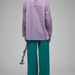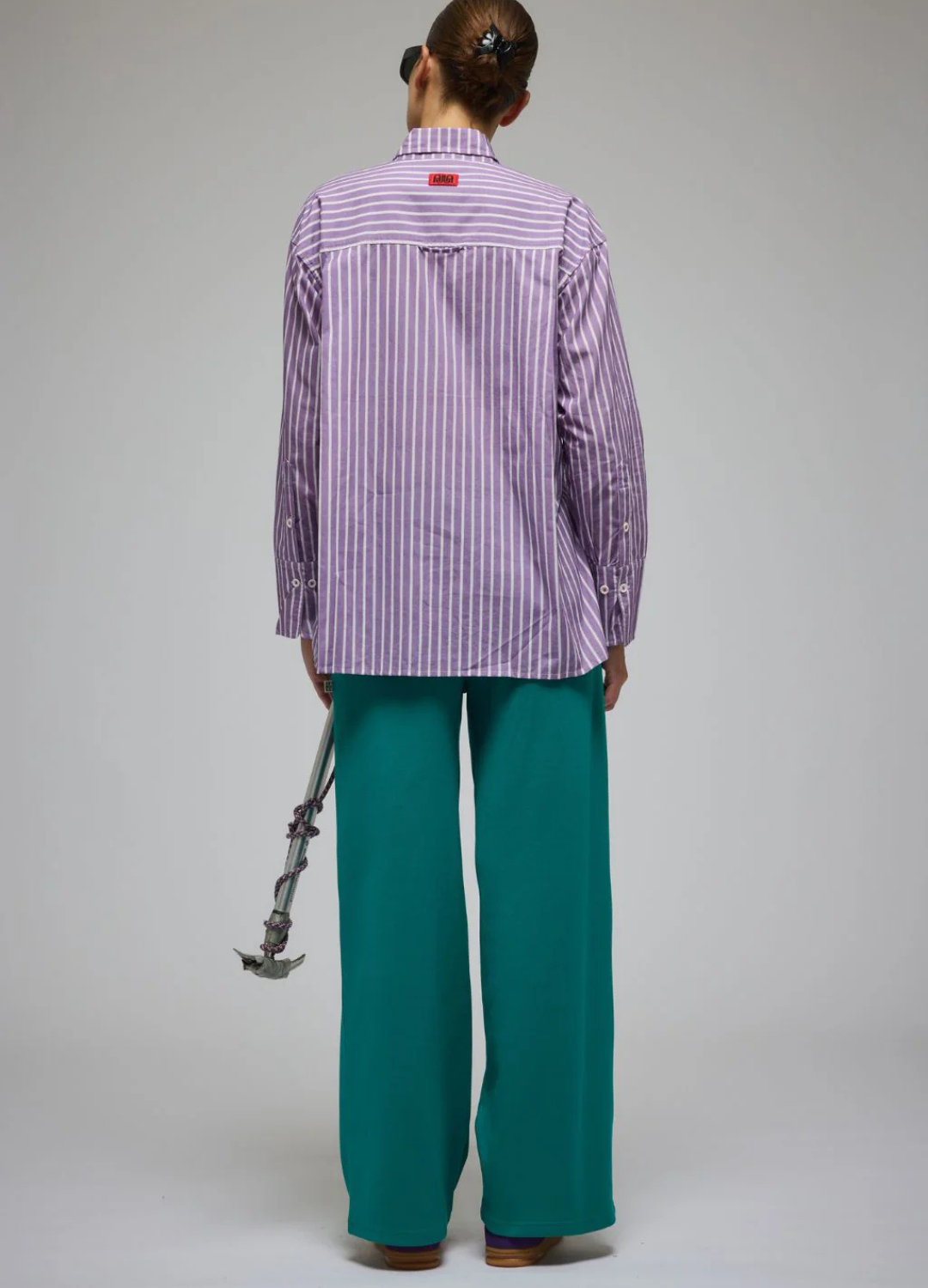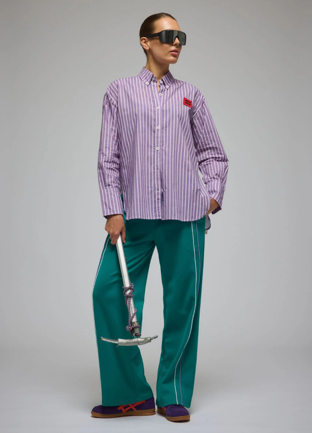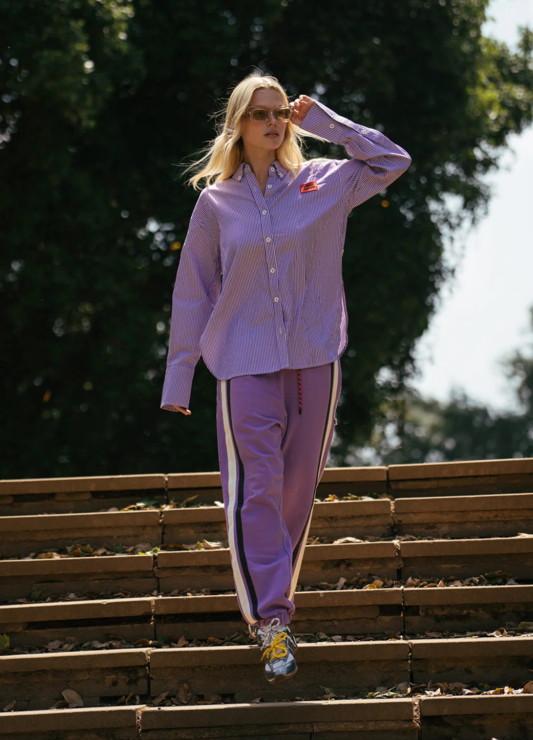 Our Bisous Cotton Stripe Shirt in Violet is endlessly comfortable, and an investment-worthy piece for your wardrobe. Featuring a relaxed curved hemline, exaggerated cuffs, buttoned collar and embroidered patch in contrasting coral on the front. Wear with our Grace Trackpant in Ocean Green and your fave sneakers for an effortlessly cool everyday look.
