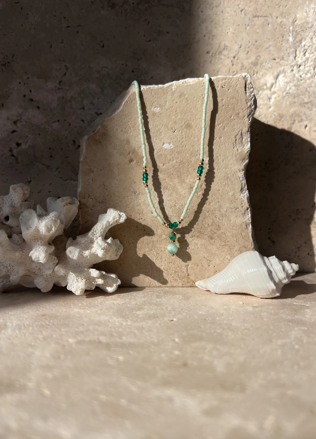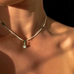 This necklace weaves together delicate aqua glass Japanese seed beads, deep emerald hues, and warm 18k gold-filled accents, all crowned by an irridescent blue moonstone pendant. A subtle nod to the ocean’s ever-changing colours, it carries a sense of serene underwater beauty.