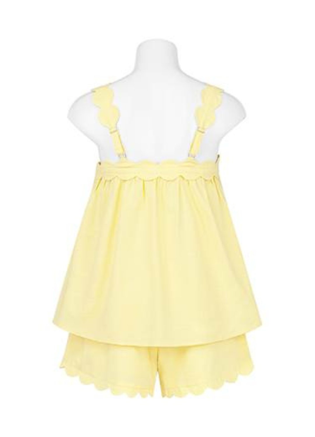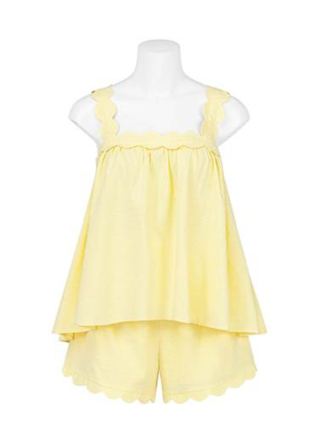 Brighten your wardrobe with this stunning set designed for effortless style and comfort. The set features a lightweight, breezy top with delicate scalloped edging that adds a feminine touch to the clean, modern silhouette. Paired perfectly with matching shorts, this outfit is ideal for warm-weather days, casual outings, and sunny getaways.