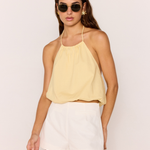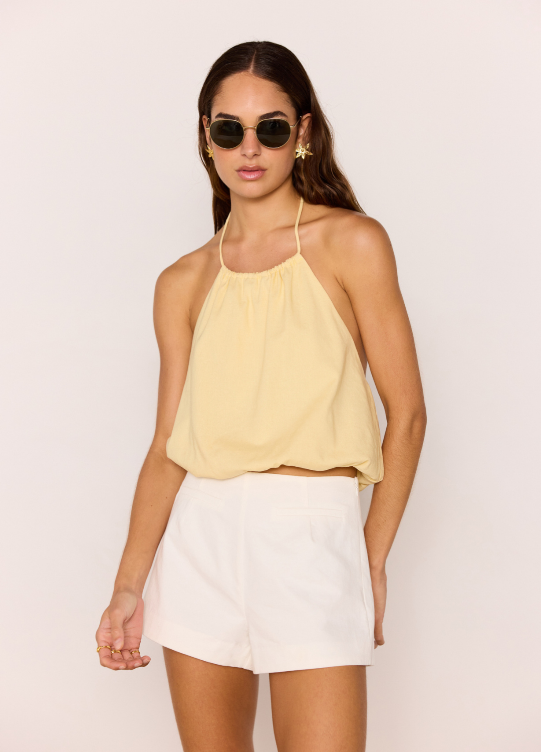 Effortlessly chic and endlessly wearable, the Ciel Halter Bubble Top is your new summer essential. Crafted from a lightweight cotton-linen blend, this top features a soft gathered neckline with a tie-up halter and a playful bubble hem for a relaxed yet elevated look. The open back adds a touch of allure - perfect for warm, golden days and balmy nights.