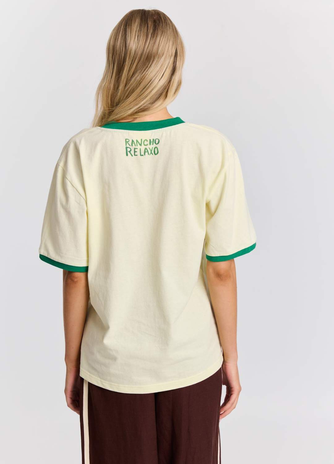 The Coco Beach Hotel Tee brings resort energy with a cheeky twist — lemon graphics, sun-faded tones, and “Rancho Relaxo” stamped on the back for anyone who needs the reminder. Cut in a relaxed regular fit with contrast green trim, it’s built for long lunches, slow mornings and soft landings.