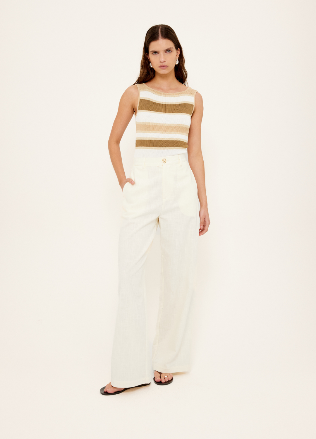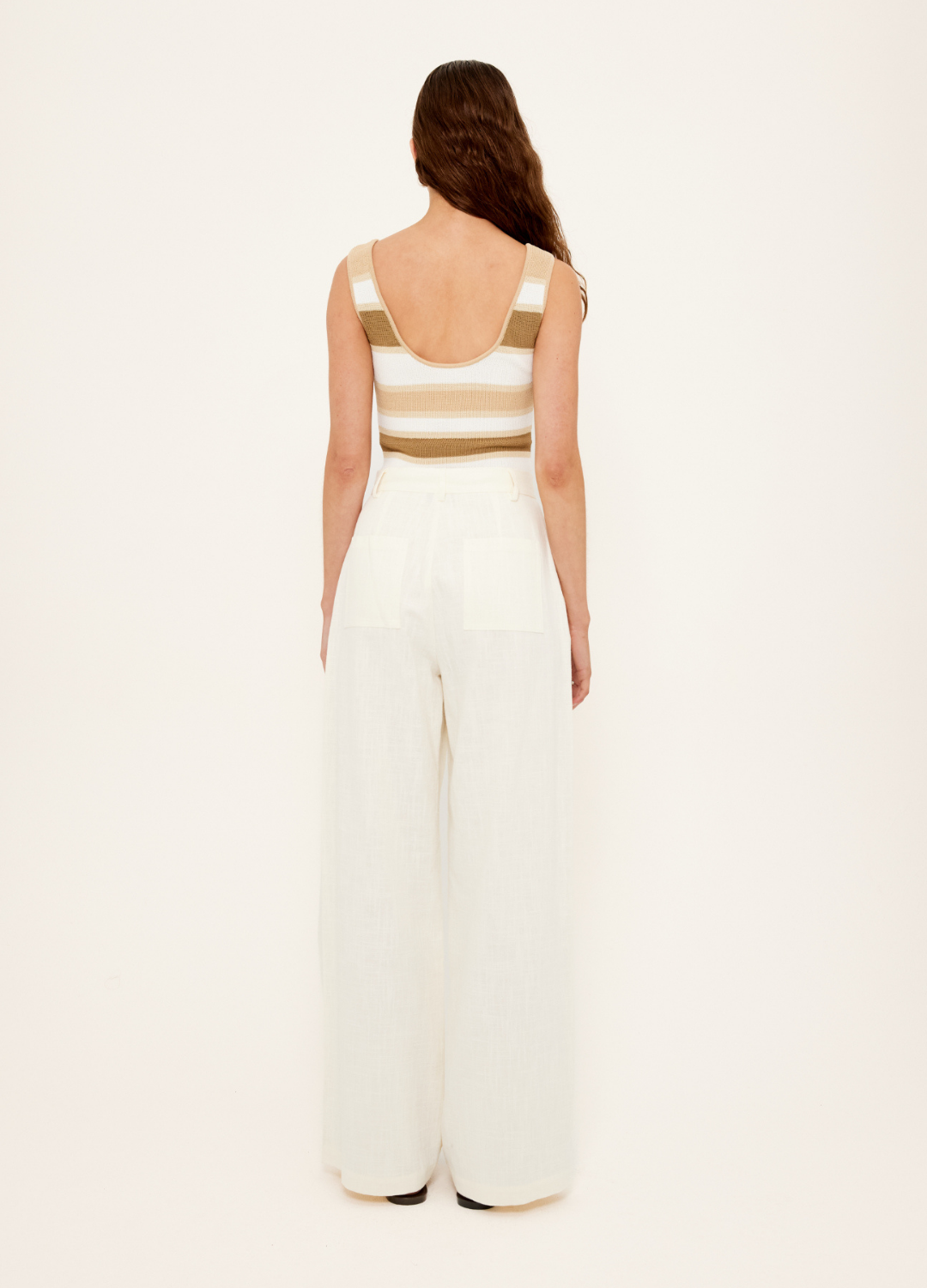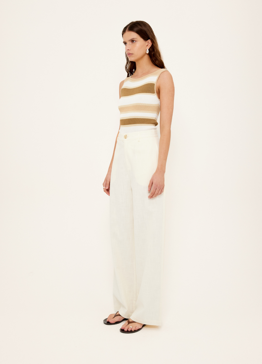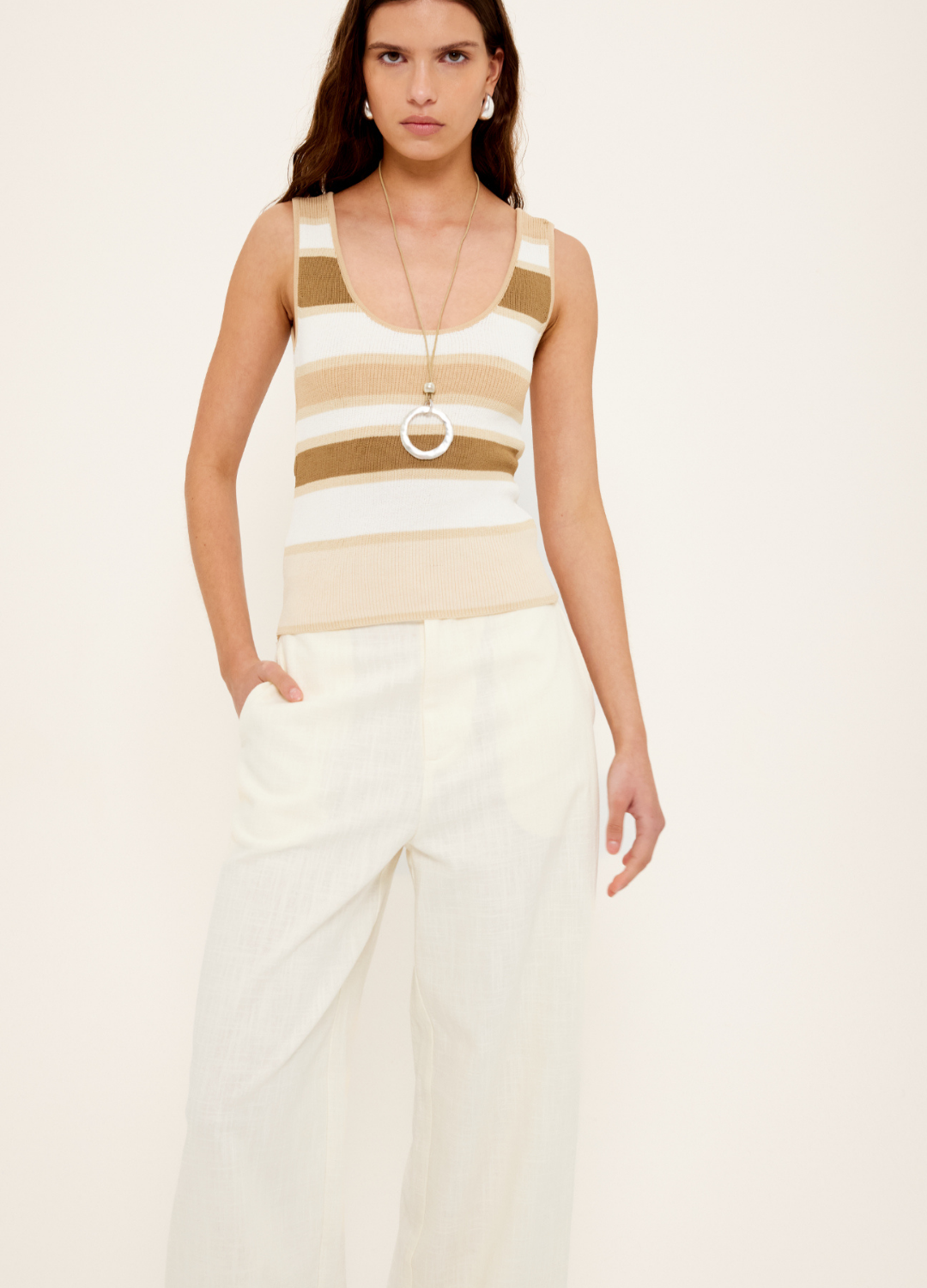 Soft, sleek and endlessly versatile, the Cortina Stripe Knit Tank brings effortless polish to warm-weather dressing. Featuring a wide stripe pattern in neutral tones, this fitted knit is finished with a scoop back and clean edges - ideal for pairing with linen pants or denim alike.