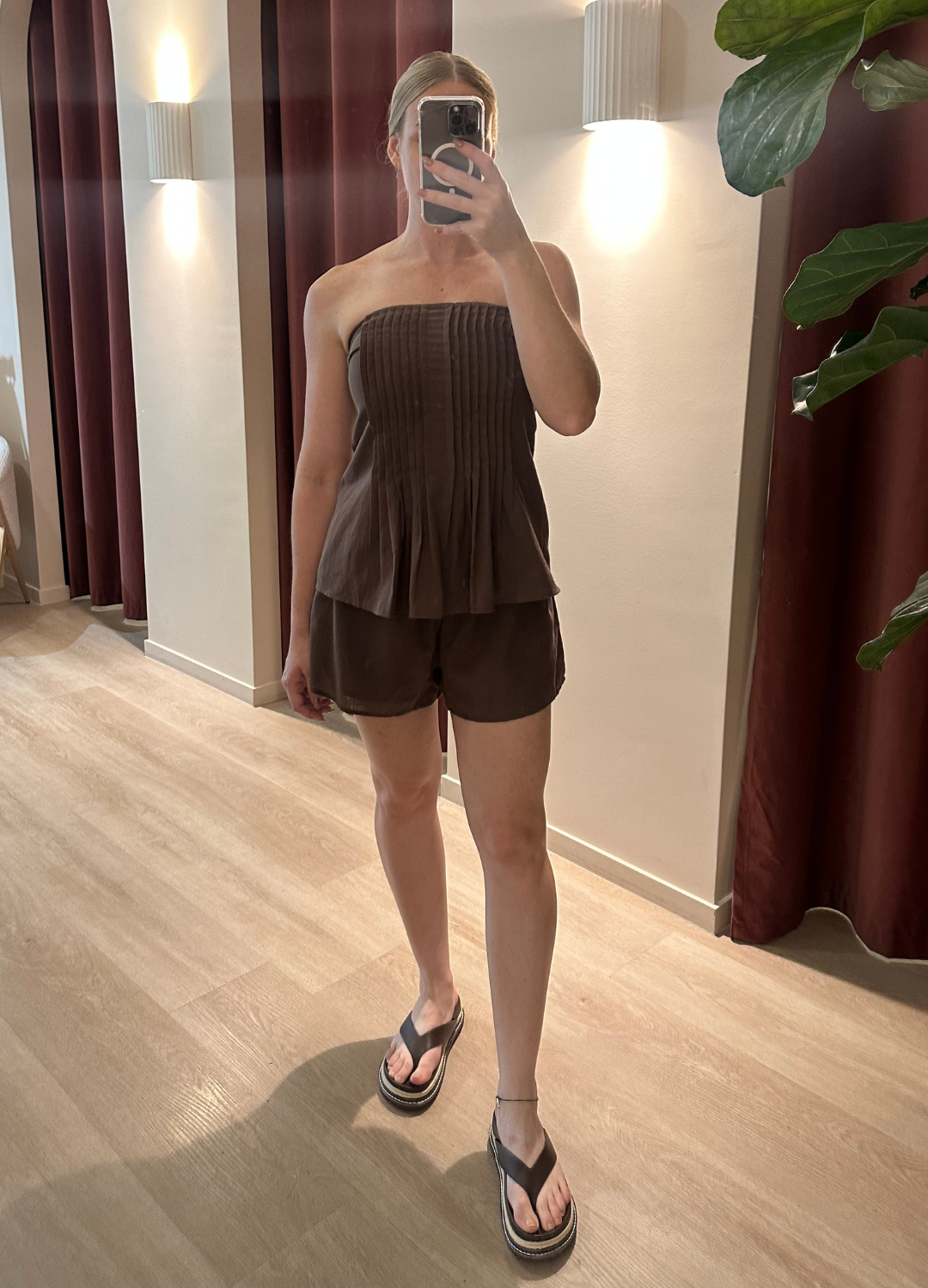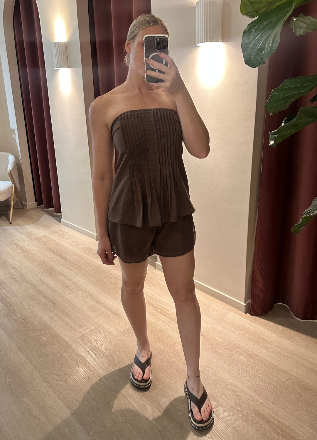 Elevate your wardrobe with the Sharni Strapless Pleat Top and Shorts Set. The strapless top features a silicone grip strip and elasticated backband for secure, comfortable wear, complemented by an invisible side zip and elegant front pleat detailing. Paired with high-waisted shorts, this set offers an elasticated waistband, side pockets, and a waist tie detail, all lined for a polished finish.