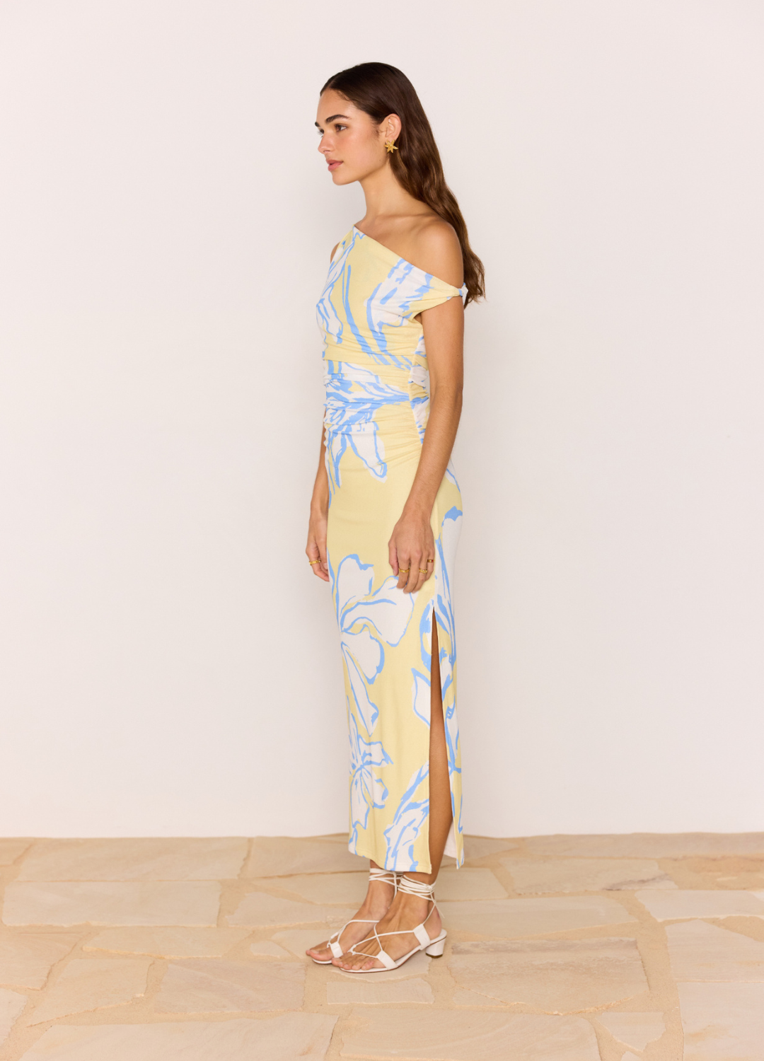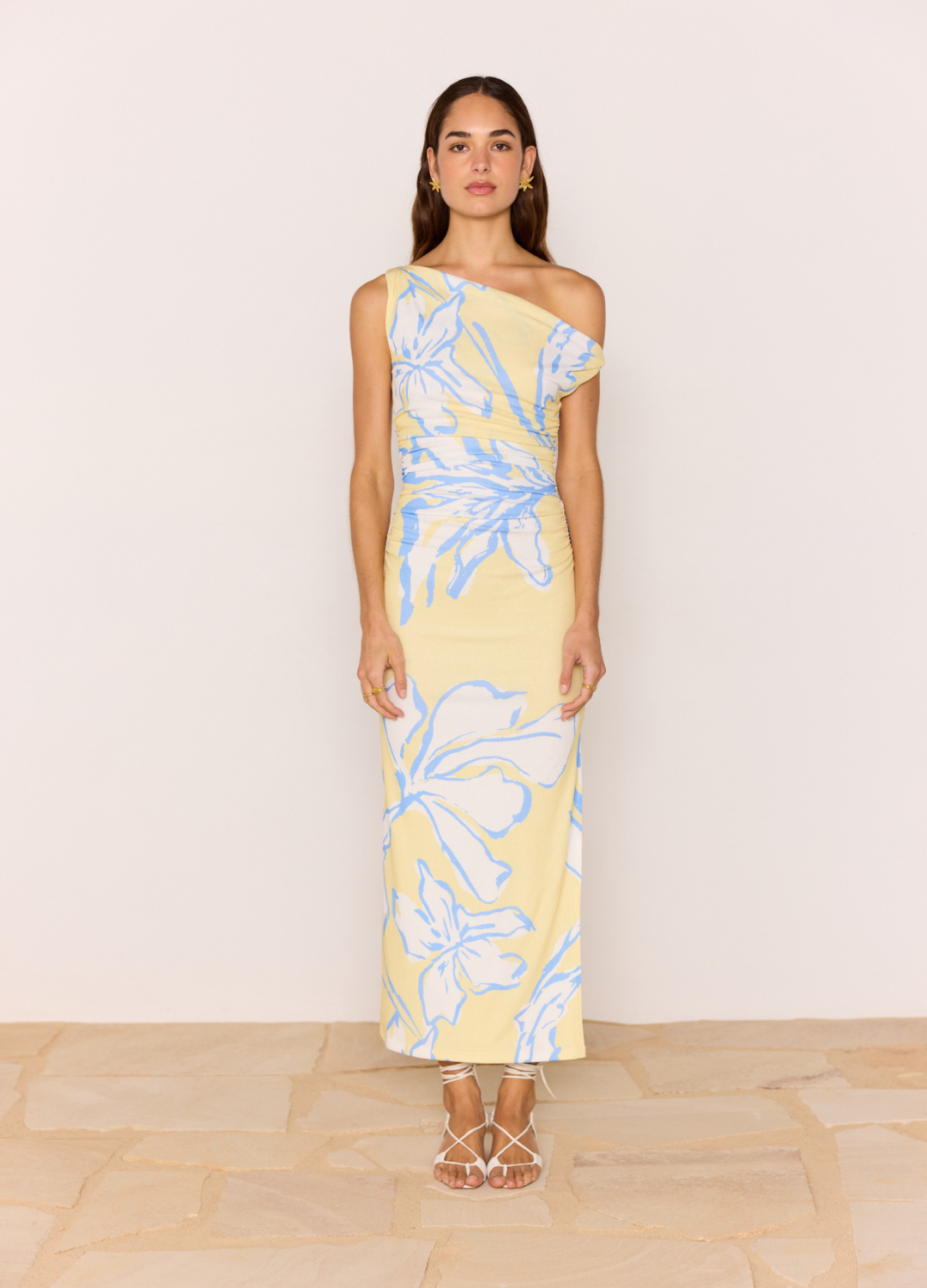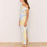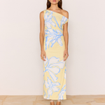 Turn heads in the Esme Yellow & Blue Floral Asymmetric Mesh Maxi Dress, featuring our statement blue floral print on a soft lemon mesh base. Designed with an asymmetrical neckline and flattering side gathering, this figure-skimming dress is your go-to for summer events and sun-soaked occasions.