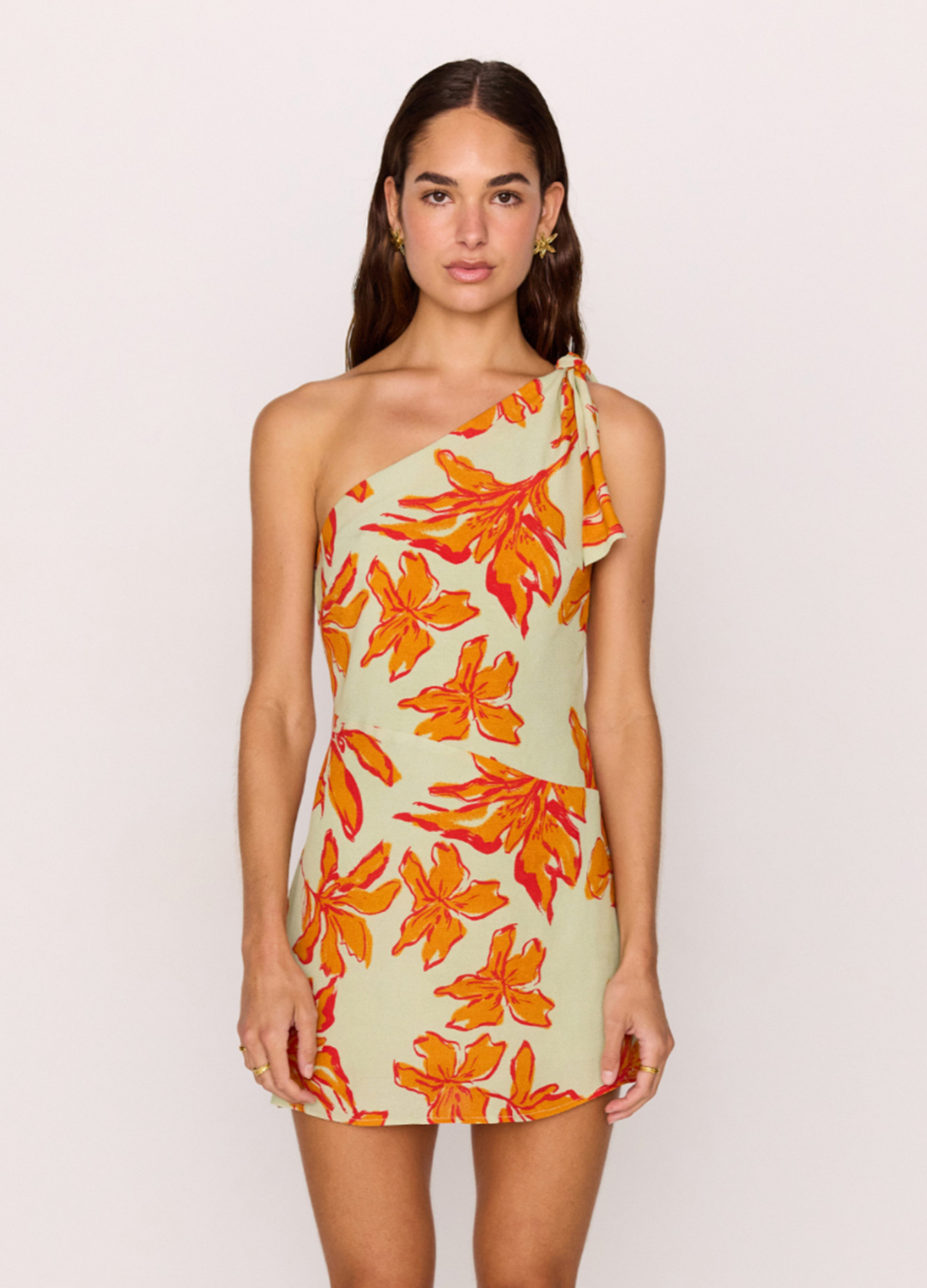Your go-to summer statement - the Estelle Mini Dress combines effortless elegance with bold, beach-to-bar energy. Designed in our exclusive sunset floral print, this one-shoulder silhouette features a soft draped tie detail and a breezy mini length that moves beautifully with you. Perfect for warm nights or thrown over your matching Estelle swim.