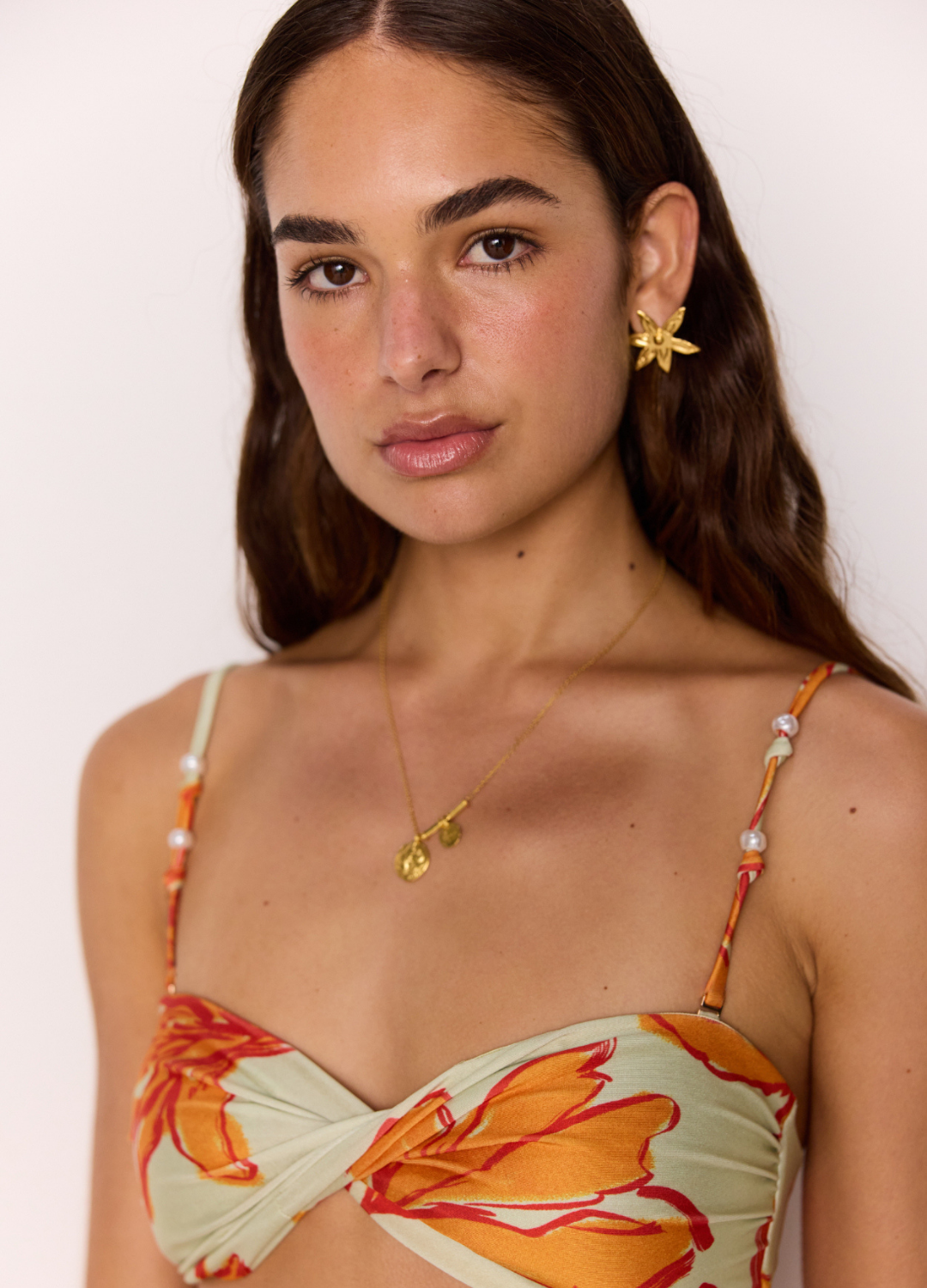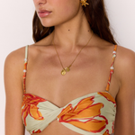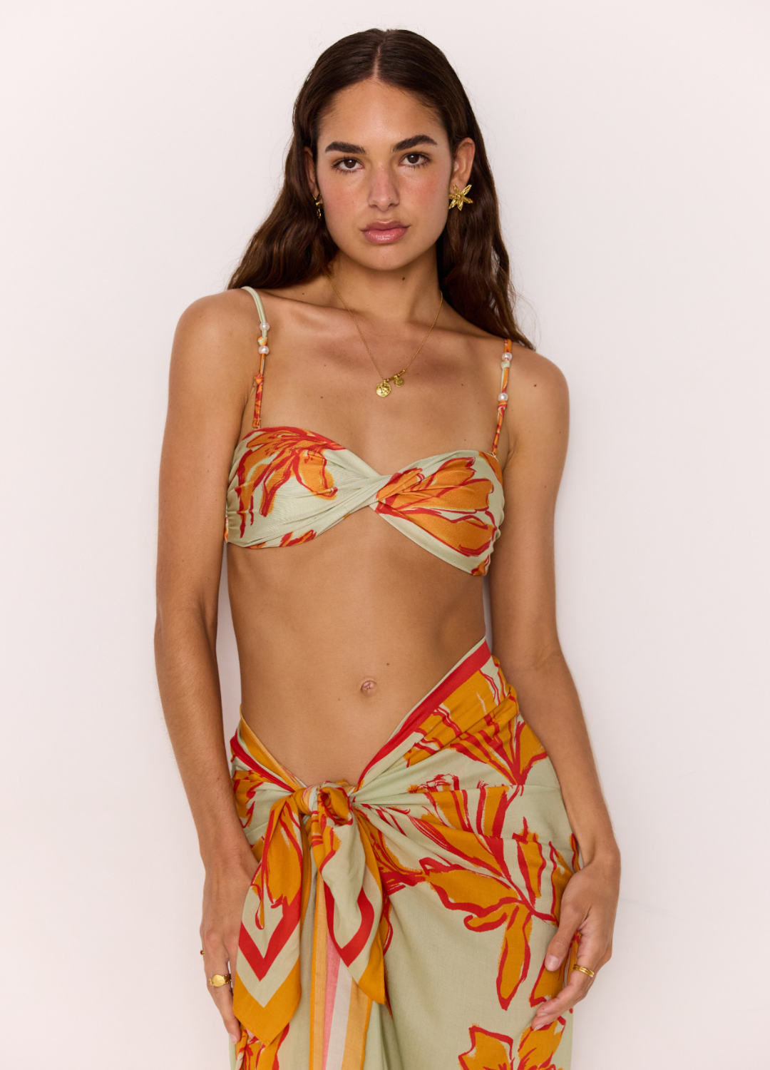 Turn heads this summer in the Estelle Twist Bikini Top. Designed in our exclusive sunset floral print, this playful silhouette features a twisted front detail and dainty beaded straps that add a touch of bohemian charm. With adjustable shoulder straps and a clasp back closure, it’s the perfect mix of comfort and style for long beach days.