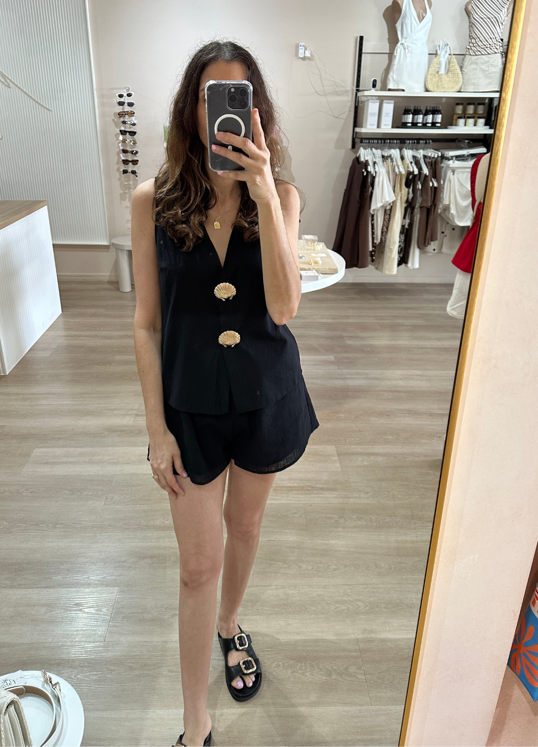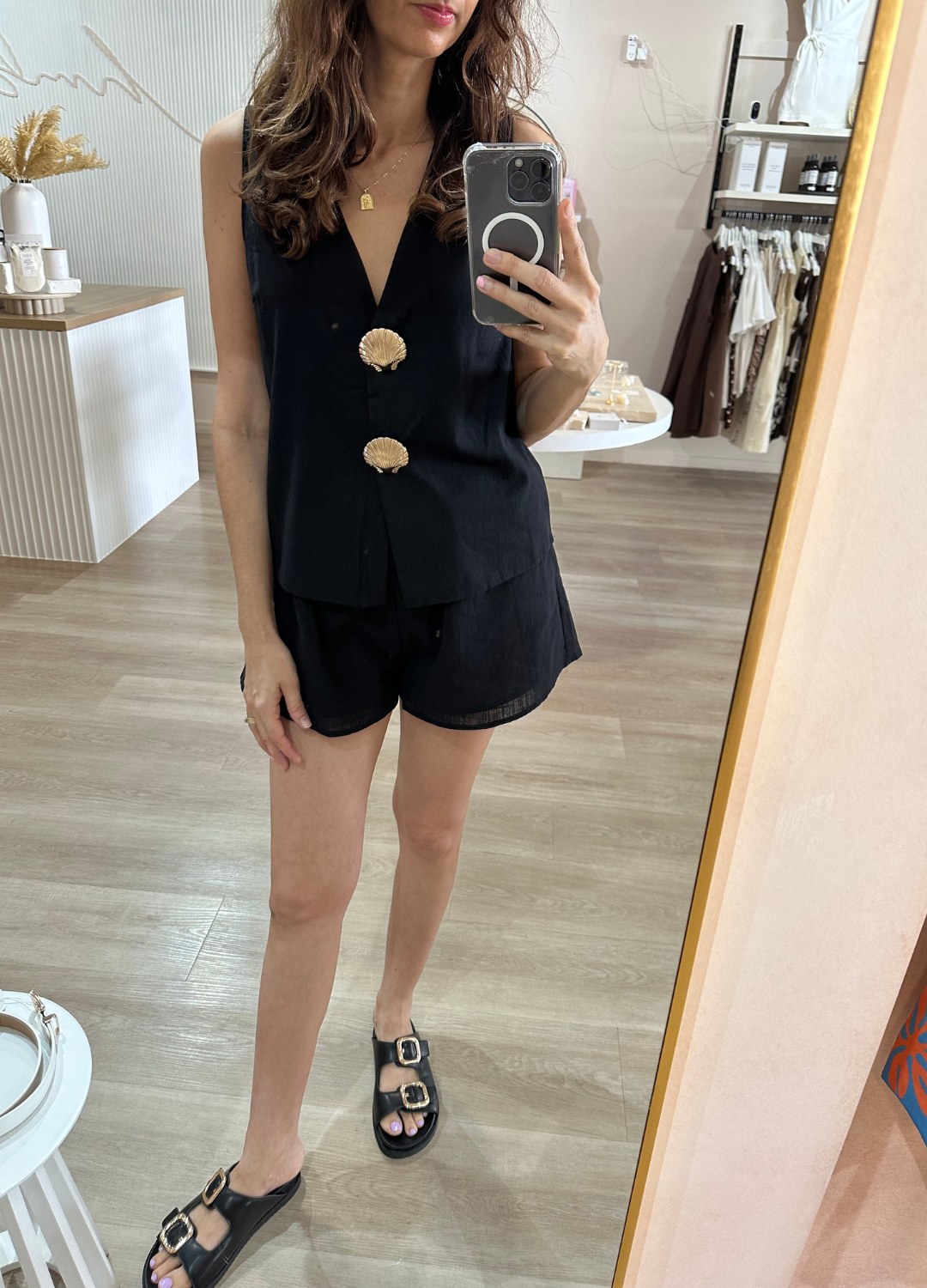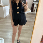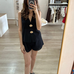 Another gorgeous set by By Frankie the top features a sleeveless cut with a V-neckline and button-down front, with removable gold shell brooches and a lined front for comfort. The shorts, made from 100% cotton, feature an elasticated waistband and pockets.