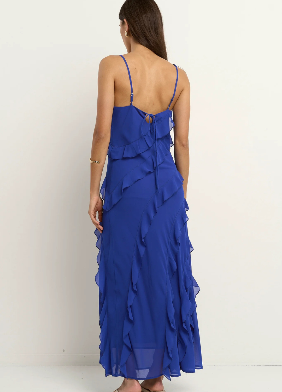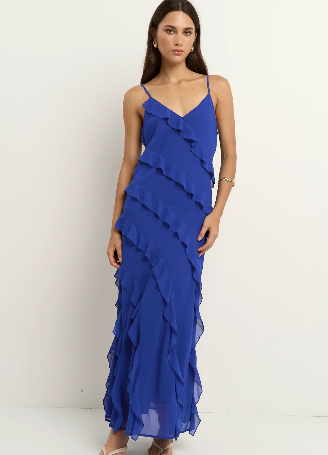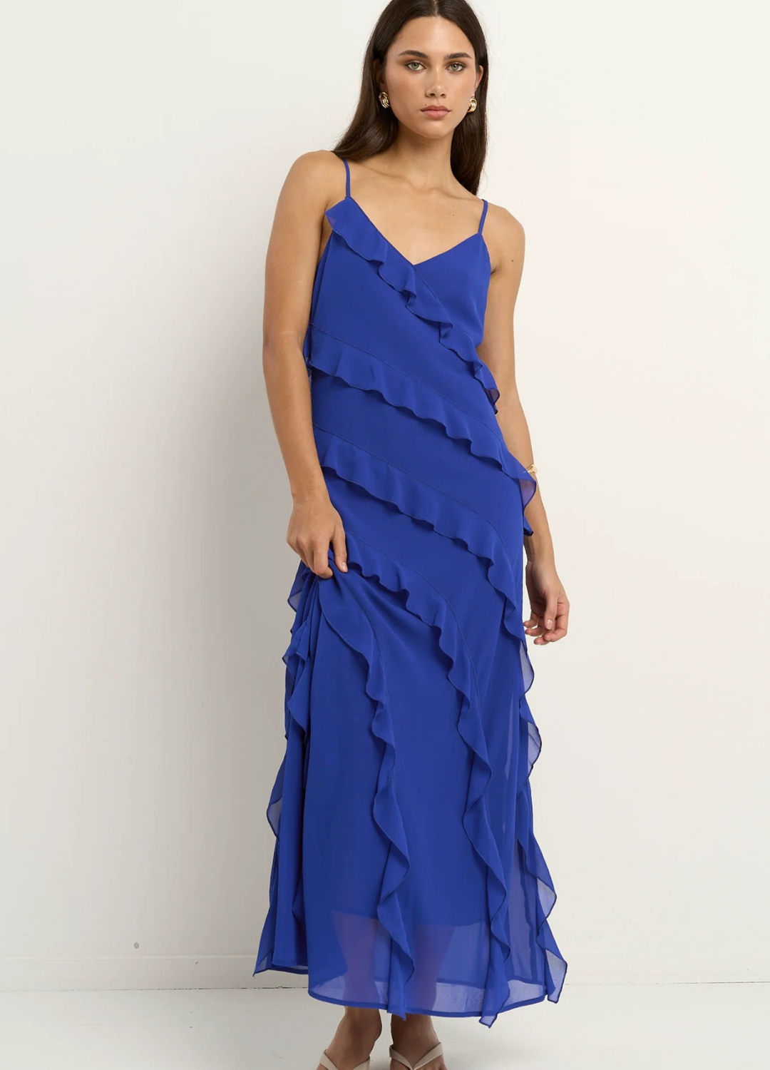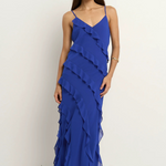 The Galore Electric Blue Dress is a showstopper with serious wow-factor. Cut on the bias for an ultra-flattering drape, this vibrant number features cascading ruffles that flow with every step, ideal for turning heads at any event. Its rich hue and floaty finish make it a total joy to wear.
