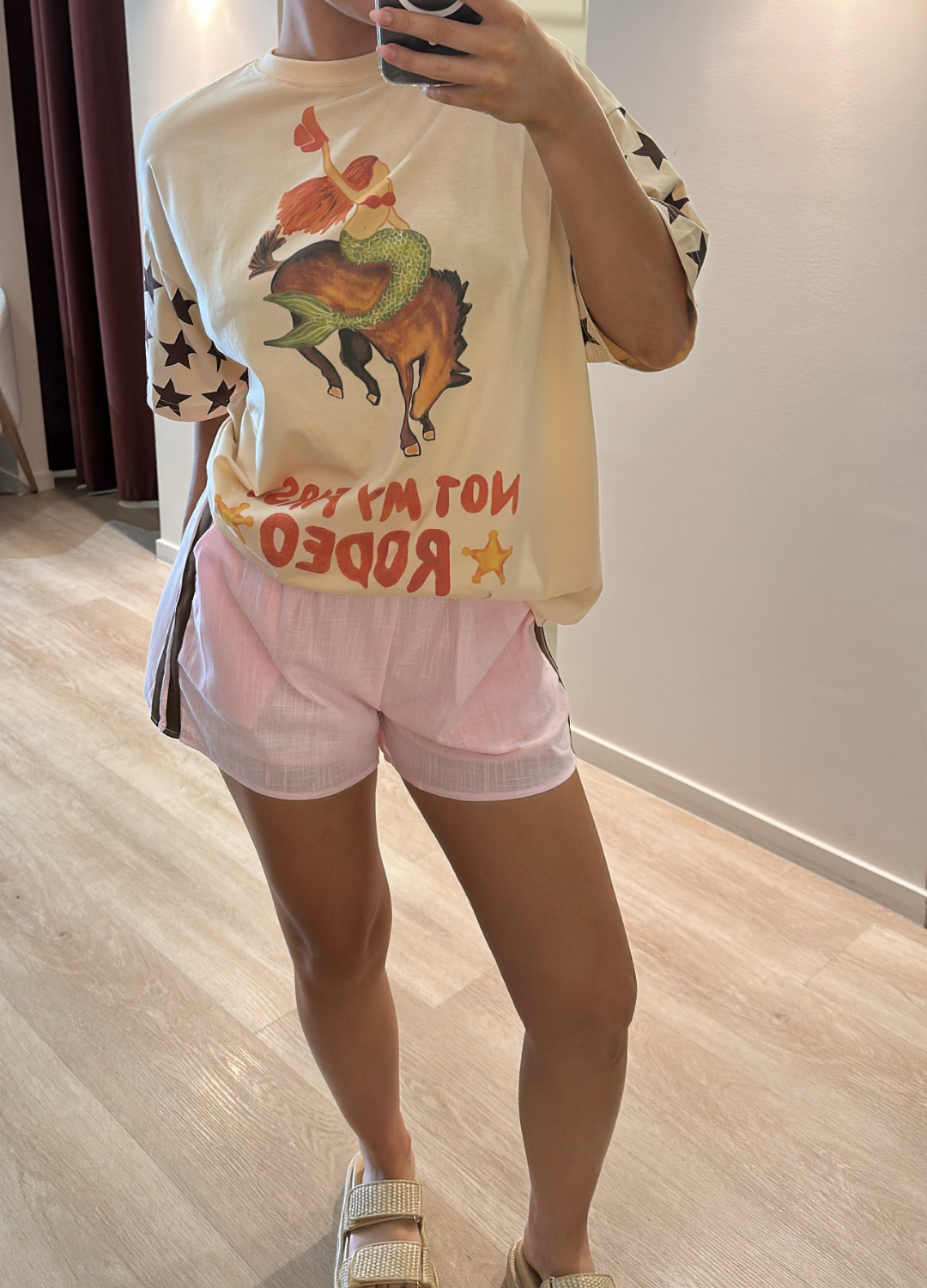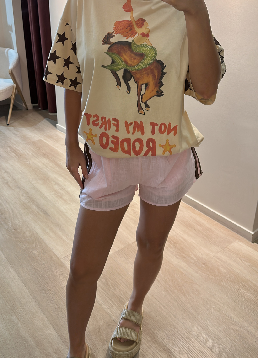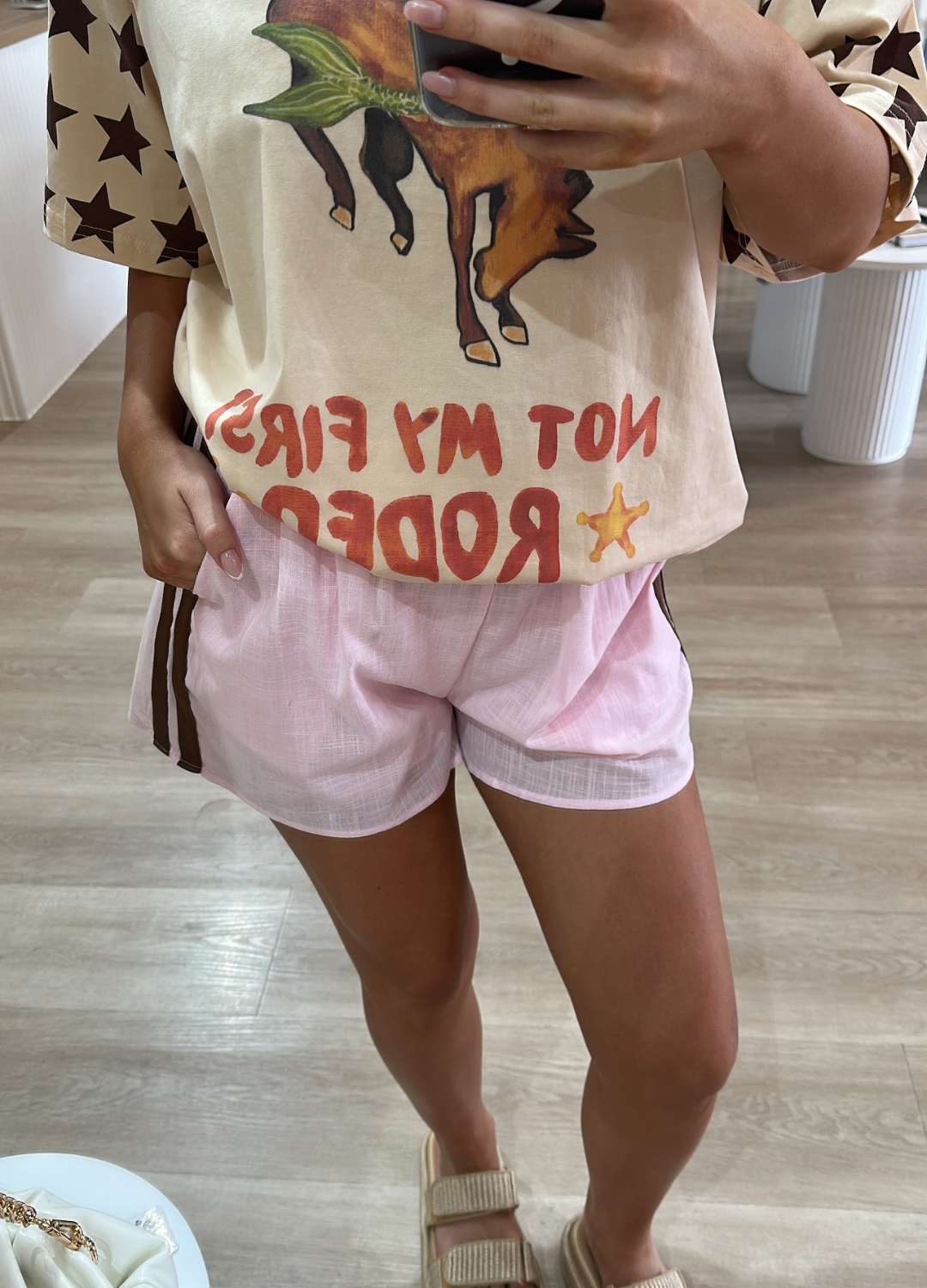 These Shorts were crafted with a lightpink, thin, Airy Fabric that is soft and breathable. They feature an elastic waistband with gentle gathers, giving them a relaxed fit. On each side, there are contrasting brown vertical panels running down adding a sporty or colour-bock detail. The legs are loose and flowy made for comfort, perfect for lounging or warm weather.