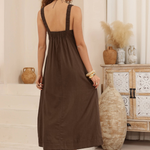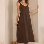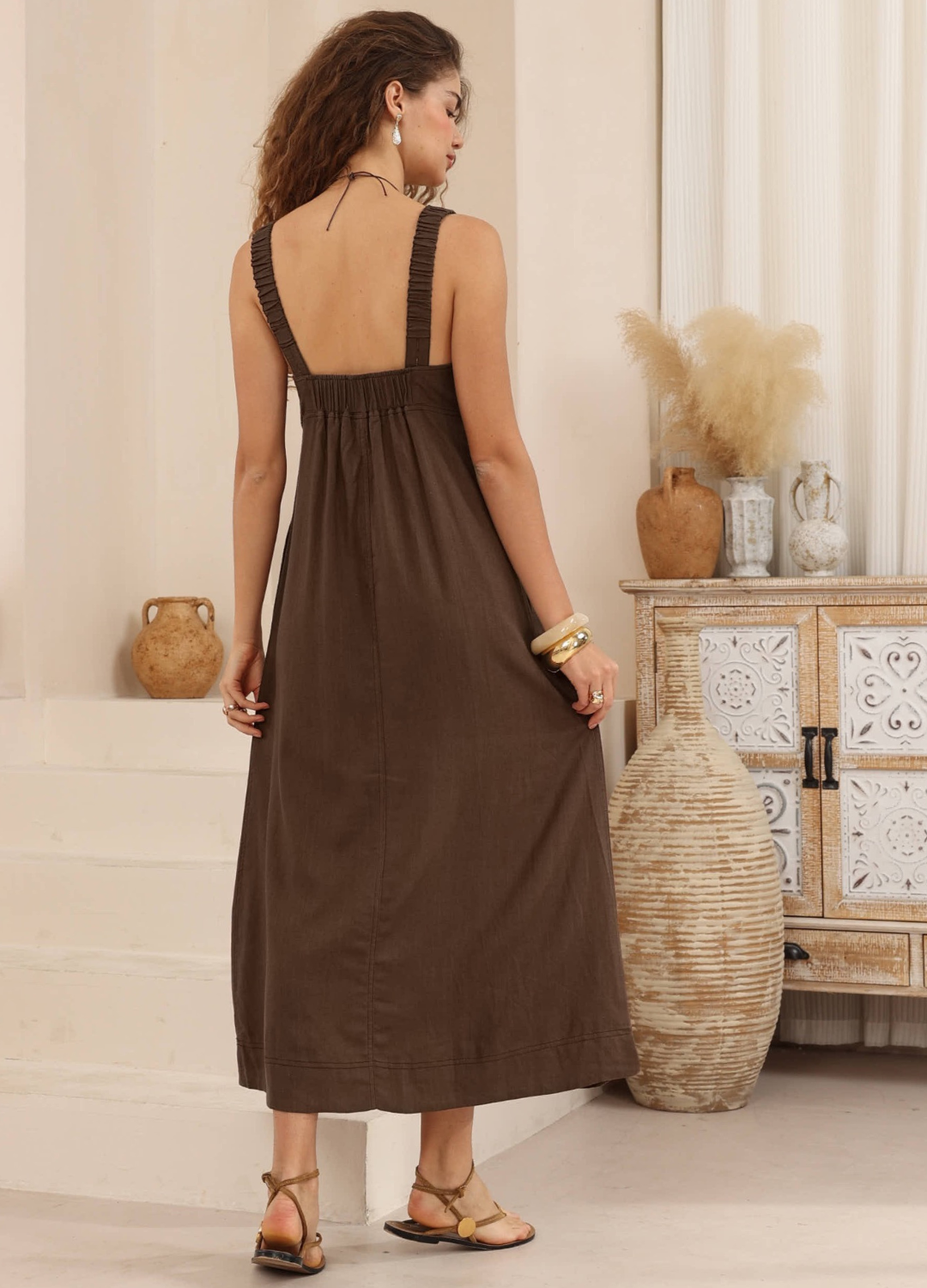 The Laine Maxi Dress is an effortlessly flattering essential in a rich brown hue. Made from a lightweight rayon–linen blend, this sleeveless maxi features a soft V-neckline, adjustable shoulder straps, and a comfortable elasticated back for an easy, flexible fit. Designed with practical side pockets and finished with subtle dark chocolate stitching, it combines breathable comfort with relaxed, everyday elegance.