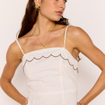 The Laurel Scallop Edge Midi Dress by MINKPINK is your new go-to for summer elegance. Made from a lightweight cotton-linen blend, this midi dress features a delicate scalloped neckline and hem with subtle contrast stitching for a modern twist. Designed with slim straps and a shirred bodice for comfort and fit, it flows into a relaxed midi-length skirt that’s perfect for day-to-night wear.
