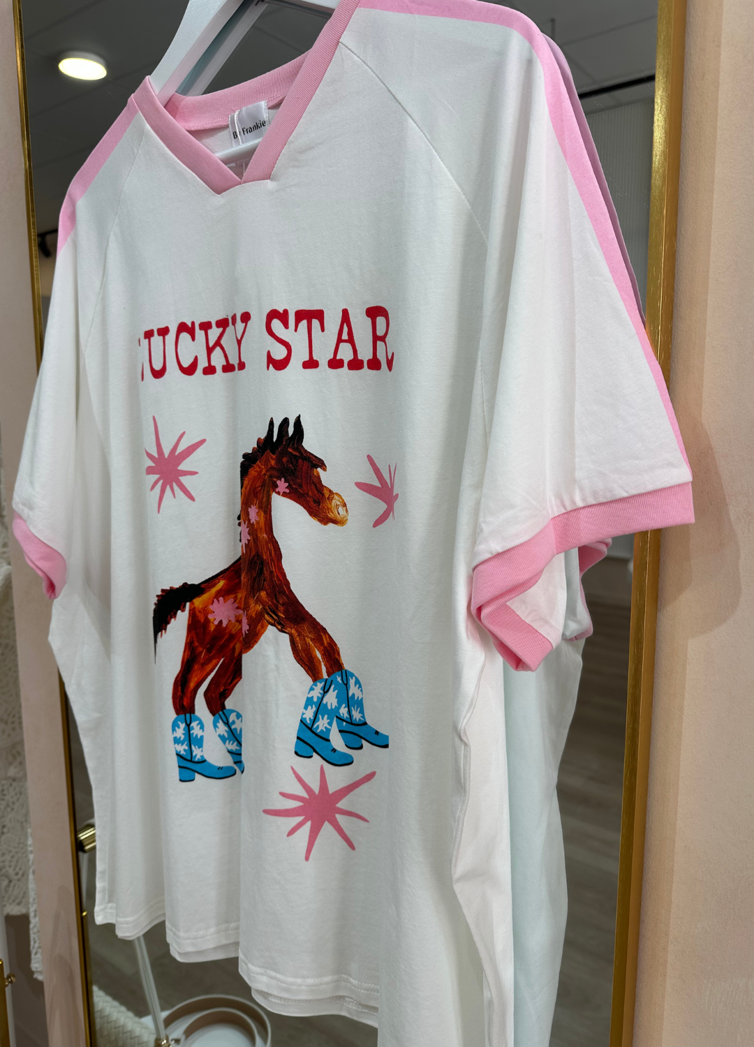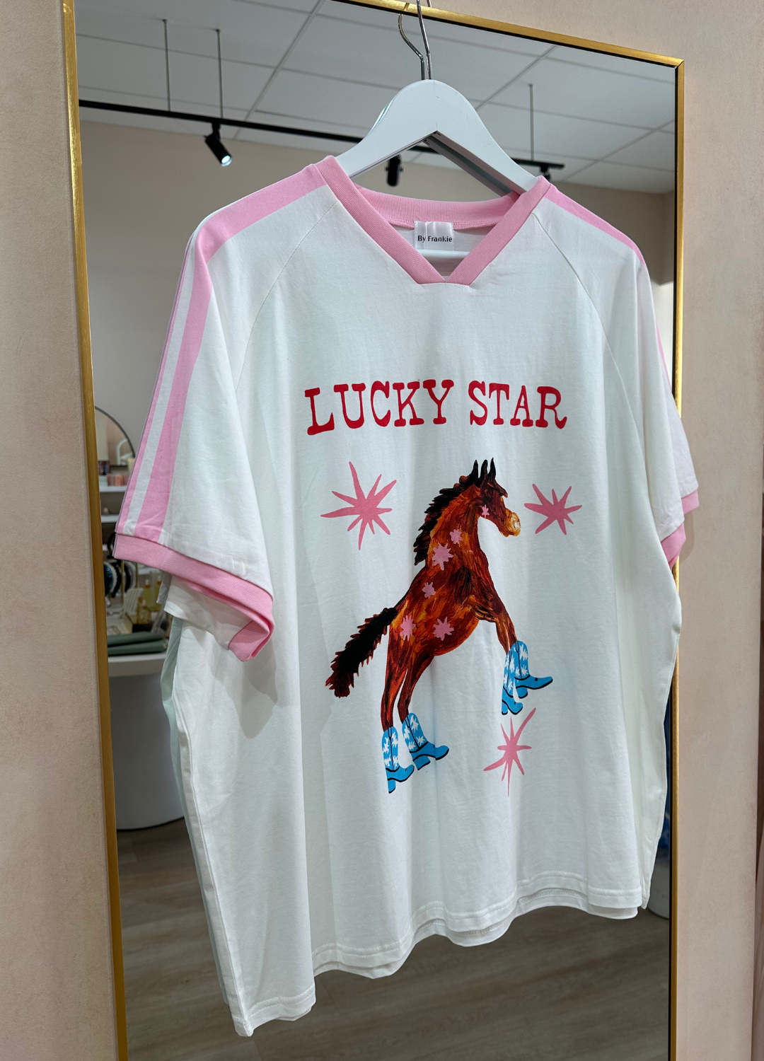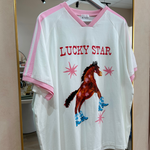 This super cute tee from By Frankie is sure to be a new fave! With a playful graphic of a horse wearing cowgirl boots & the words 'Lucky Star', it's perfect for the beach days and lounging at home on the ranch alike!