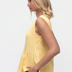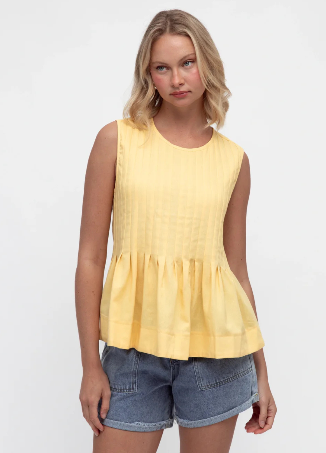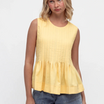 ∙ Crew neck∙ Sleeveless∙ Back keyhole with button loop closure∙ Front pintuck pleats design∙ Ruffle hemline∙ Relaxed fit