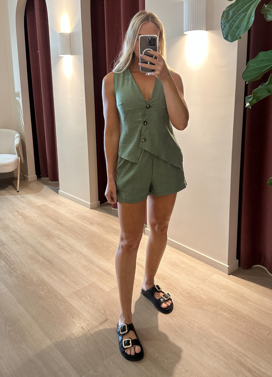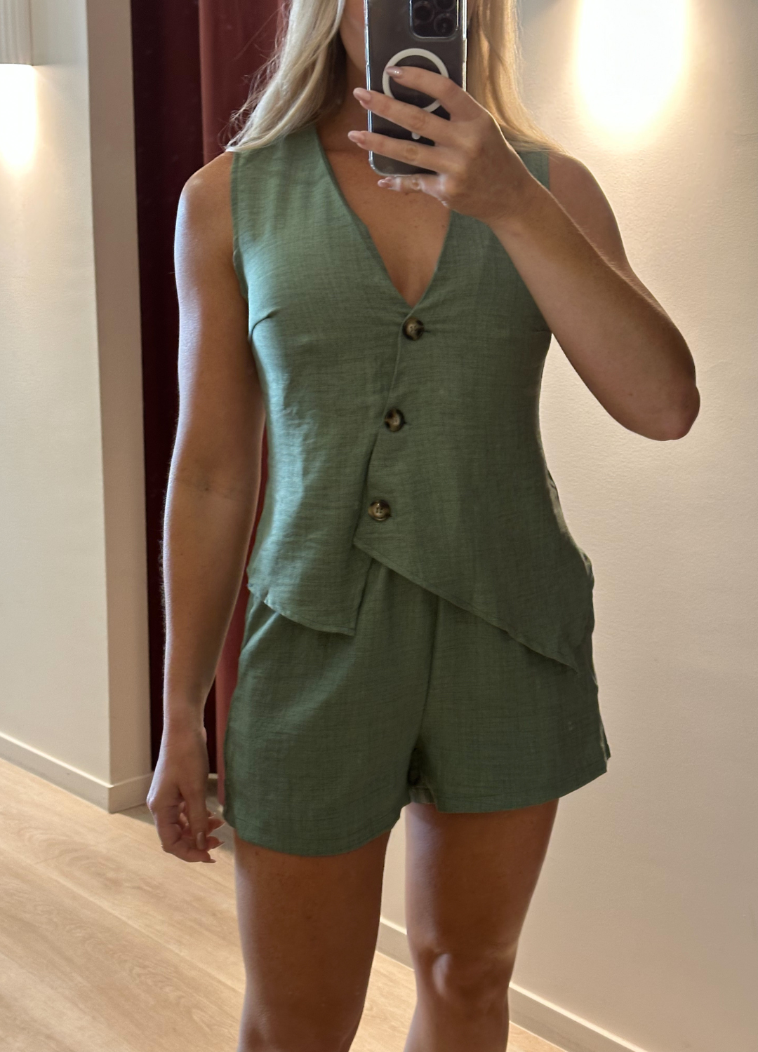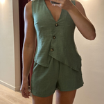 Discover timeless simplicity with the Mariam vest top and matching shorts, where comfort meets sophistication.