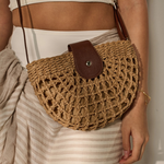 This half-moon-shaped crossbody bag features a stylish vegan leather strap and a convenient magnetic closure.