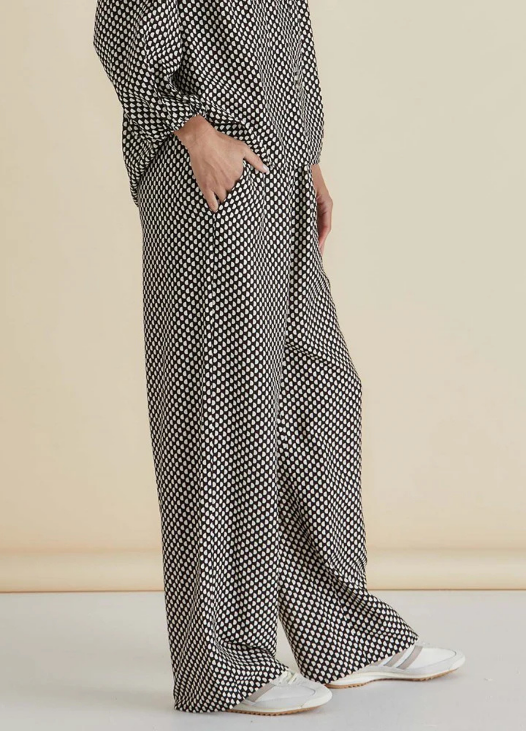 The Marilyn Pant is crafted from soft crinkle fabric for a relaxed, comfortable fit. Featuring an elasticated waistband and slant pockets, these pants offer an easy-going, stylish silhouette. The mid-high rise ensures a flattering look, while the relaxed leg fit makes them perfect for both lounging and casual outings.