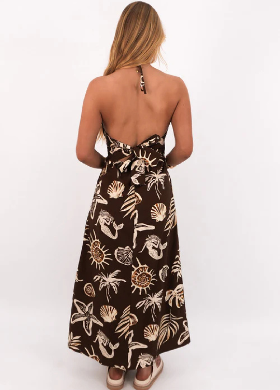 The Mermaid Palm Halter features a Maxi length and the cutest bold contrasting Mermaid and Palm print. Sunset cocktails - here we come!
