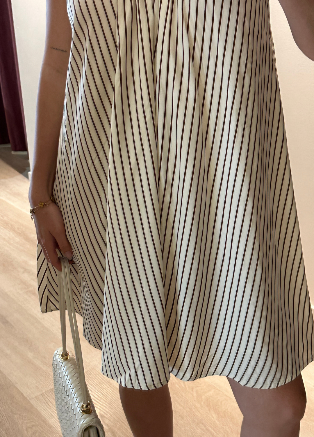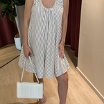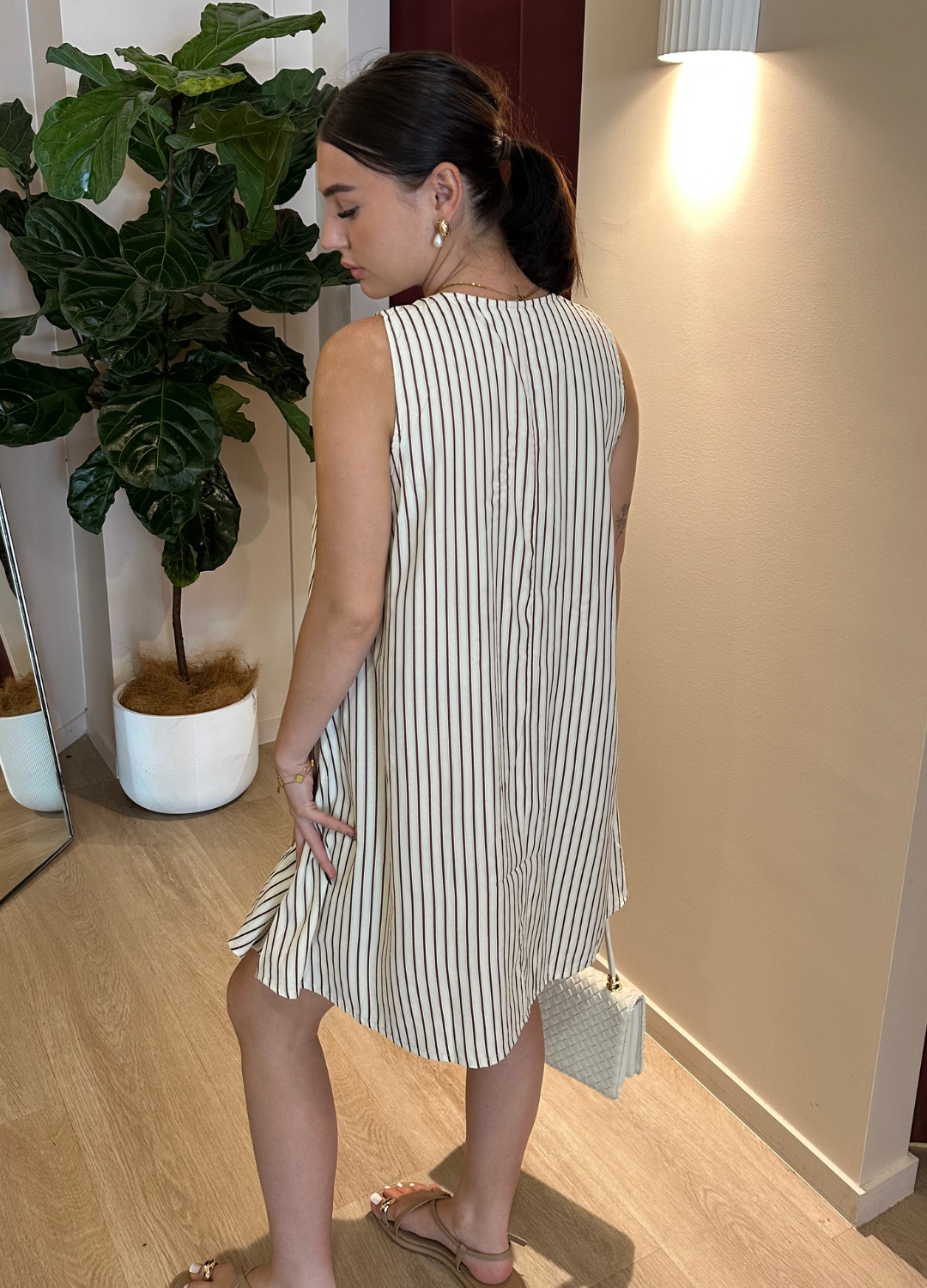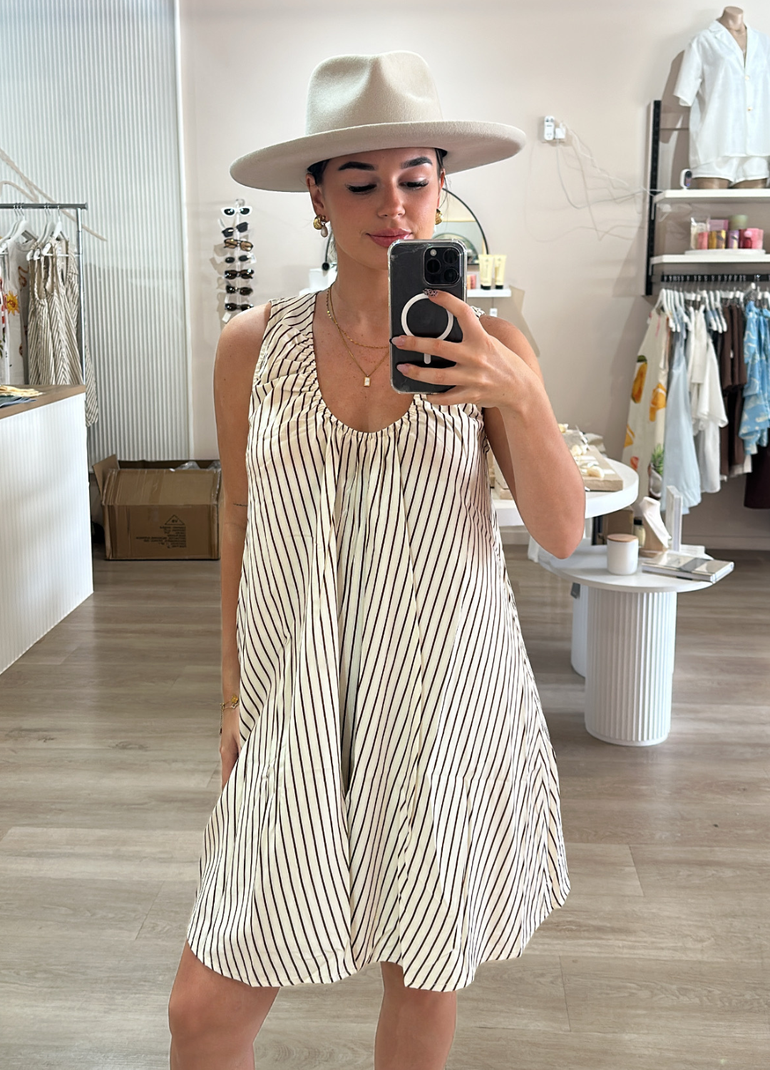 Step out in style and comfort with this cute By Frankie chocolate brown and butter pinstripe dress. This dress blends classic patterning with a relaxed, modern silhouette, perfect for warm days and easy elegance.
