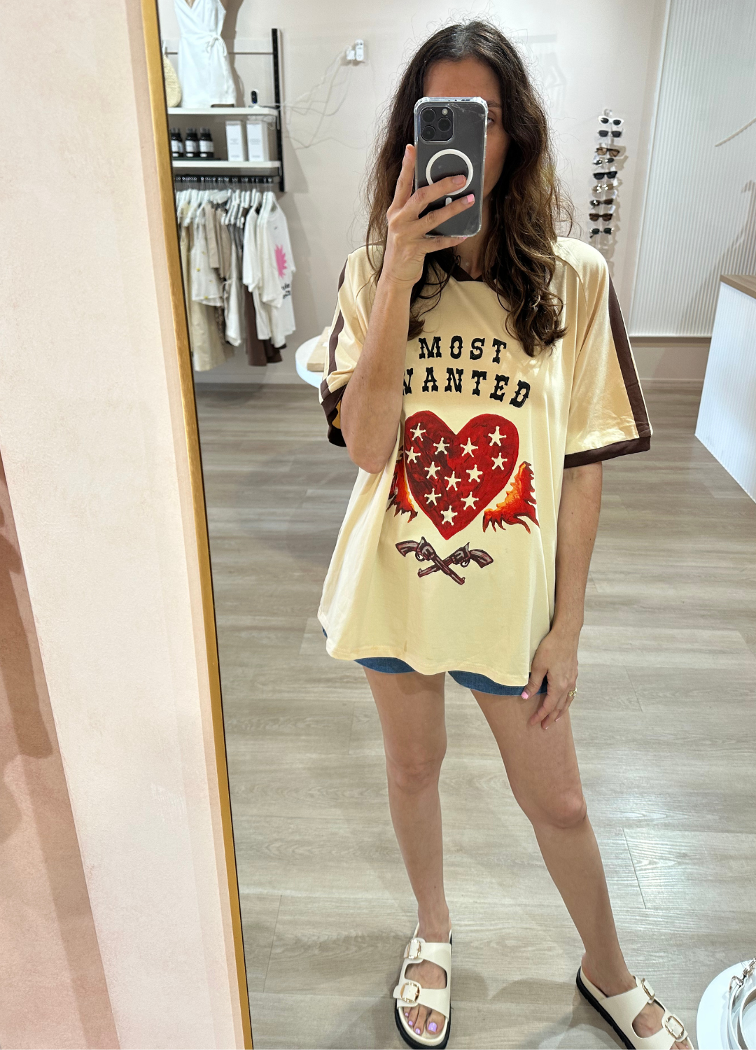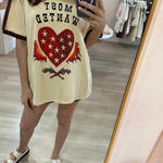 Make a statement in the most wanted tee by By Frankie. Made from 100% cotton with an oversized, boxy fit, this tee is all about attitude. The bold front print features a “Most Wanted” slogan with a love heart, flames, and guns for standout street style. Available in both crew neck and V-neck designs so you can pick your perfect fit.
