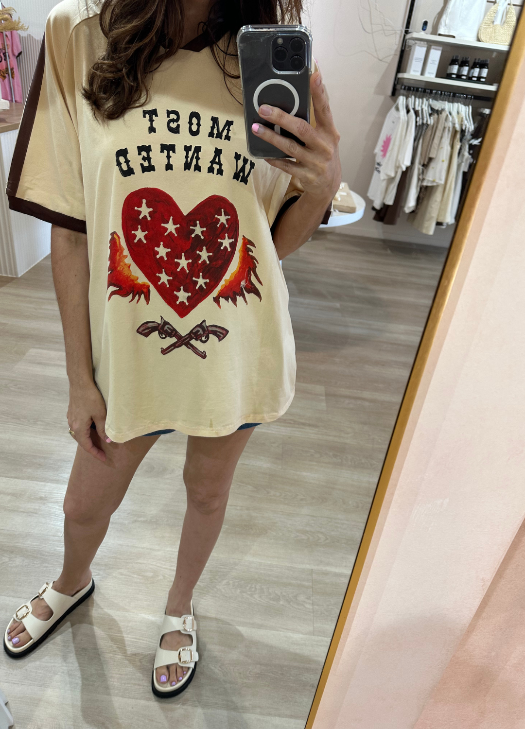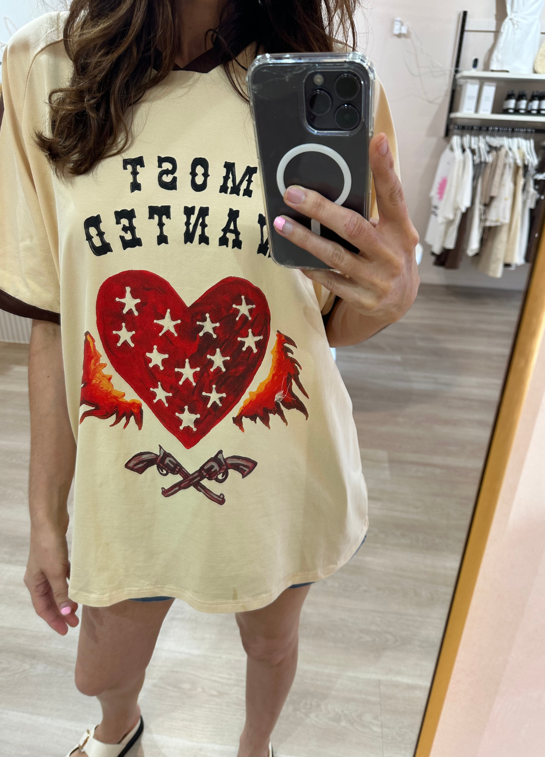 Bold “Most Wanted” slogan on the front, artwork with love heart, flames, and guns