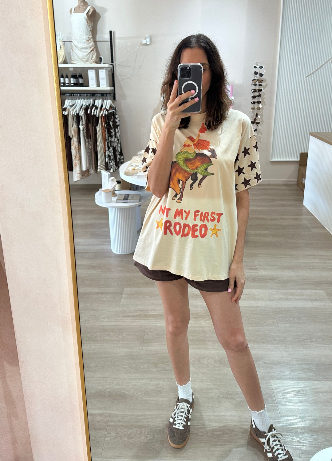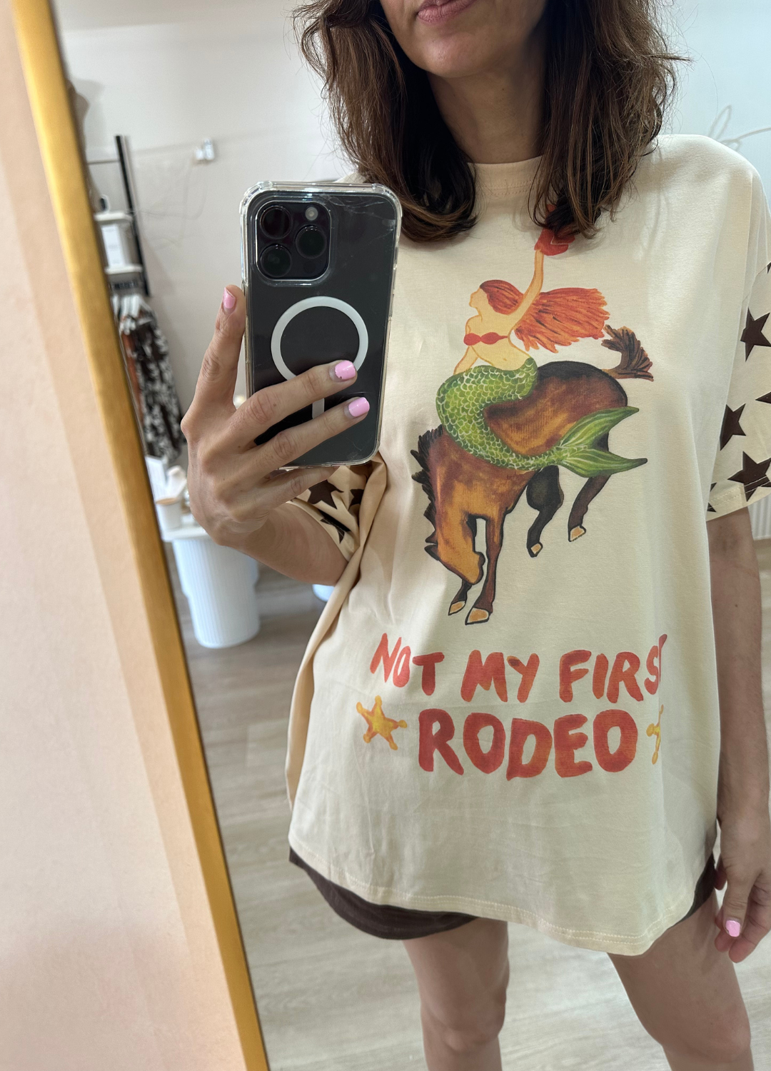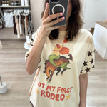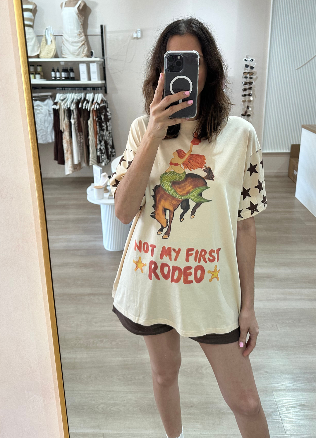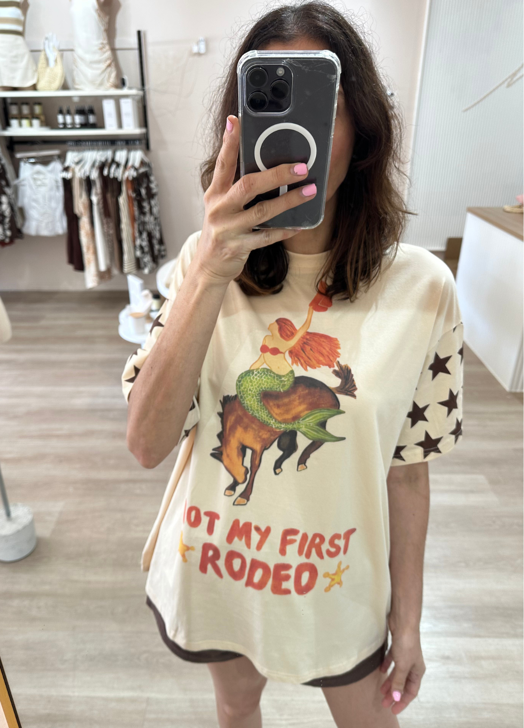 This super cute tee from By Frankie is sure to be a new fave! With a playful graphic of a rodeo mermaid & the words 'Not my first Rodeo' on the front, it's perfect for the beach days and lounging at home on the ranch alike!
