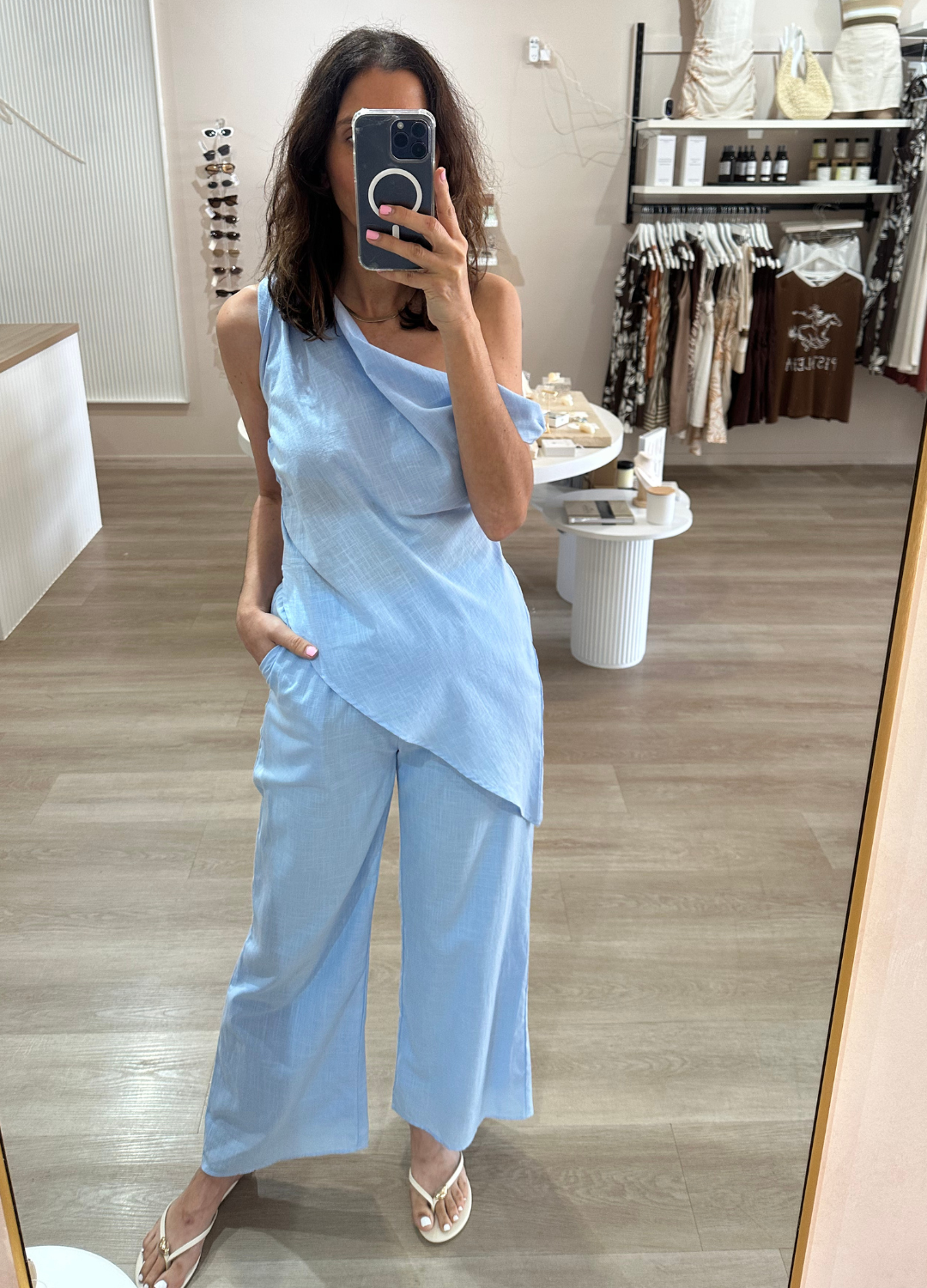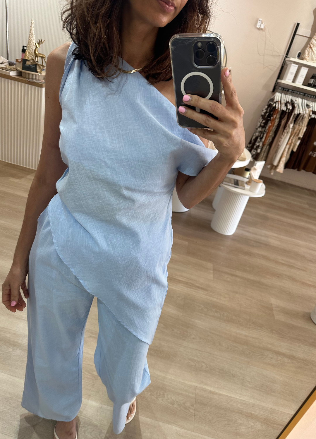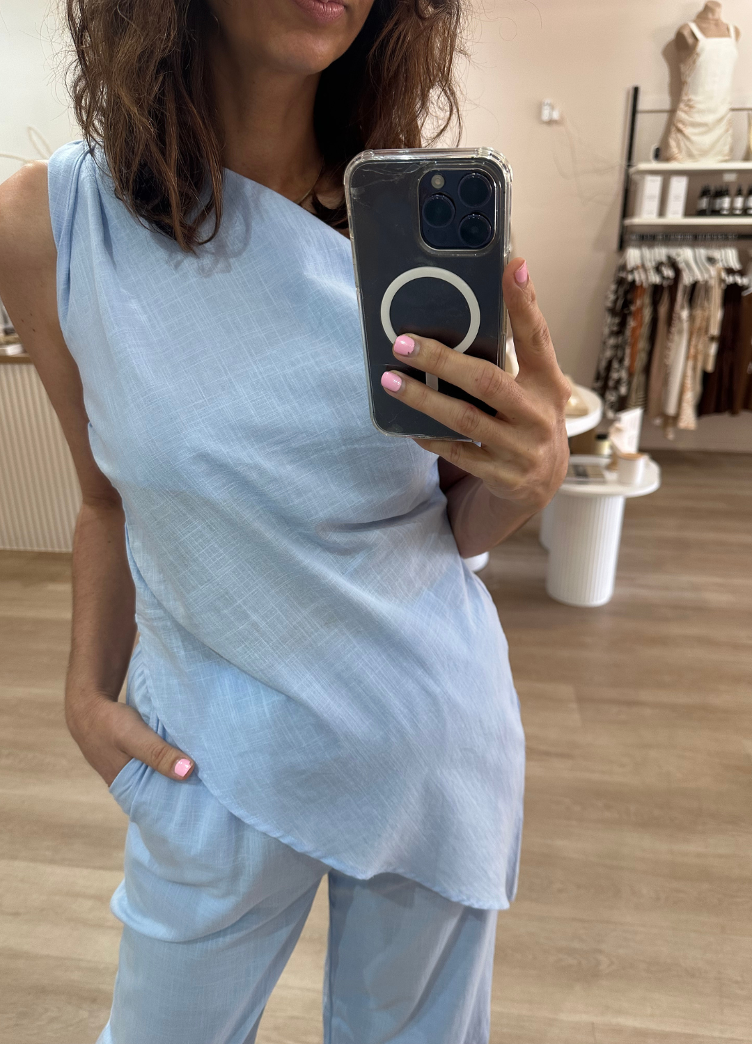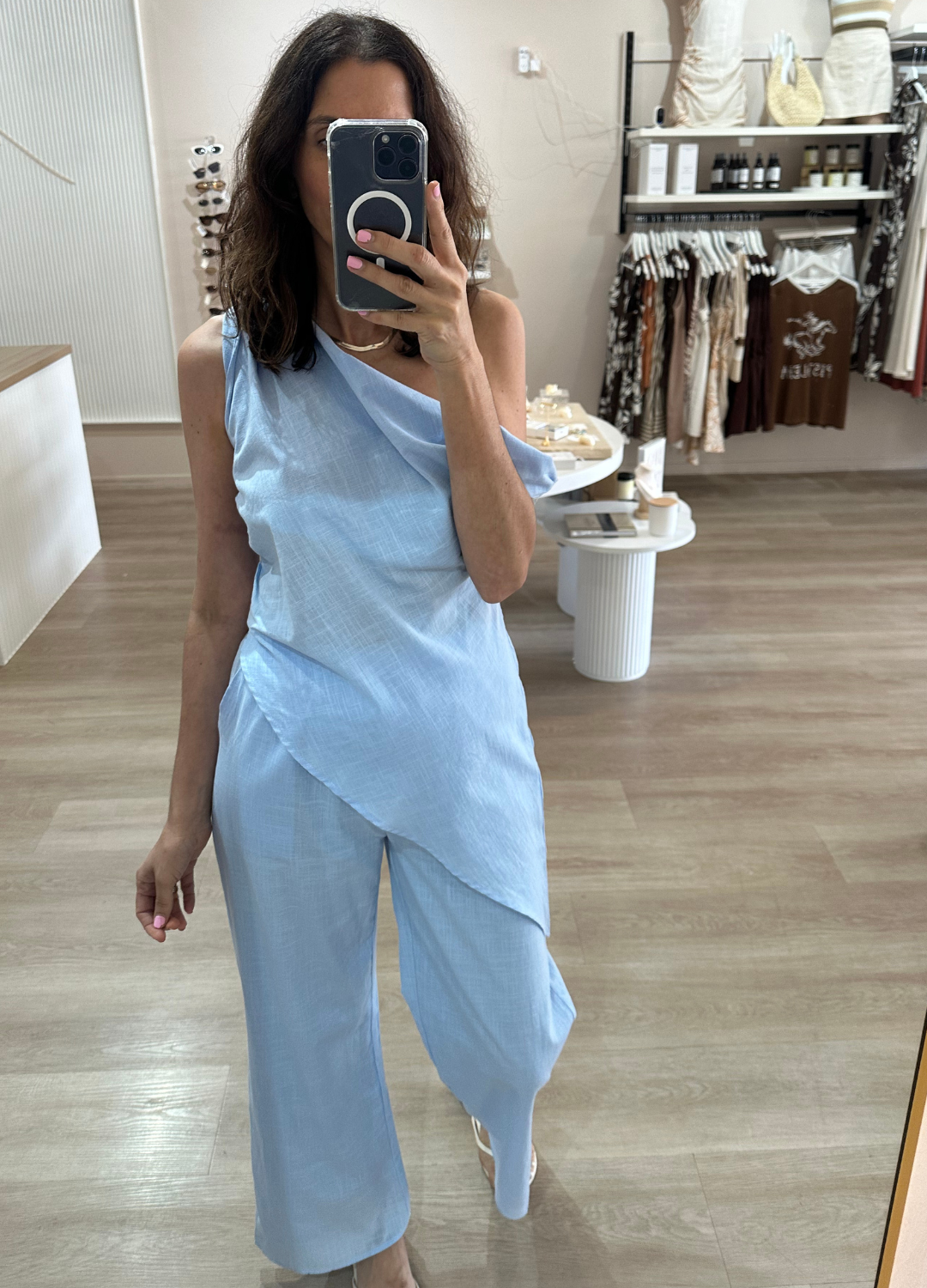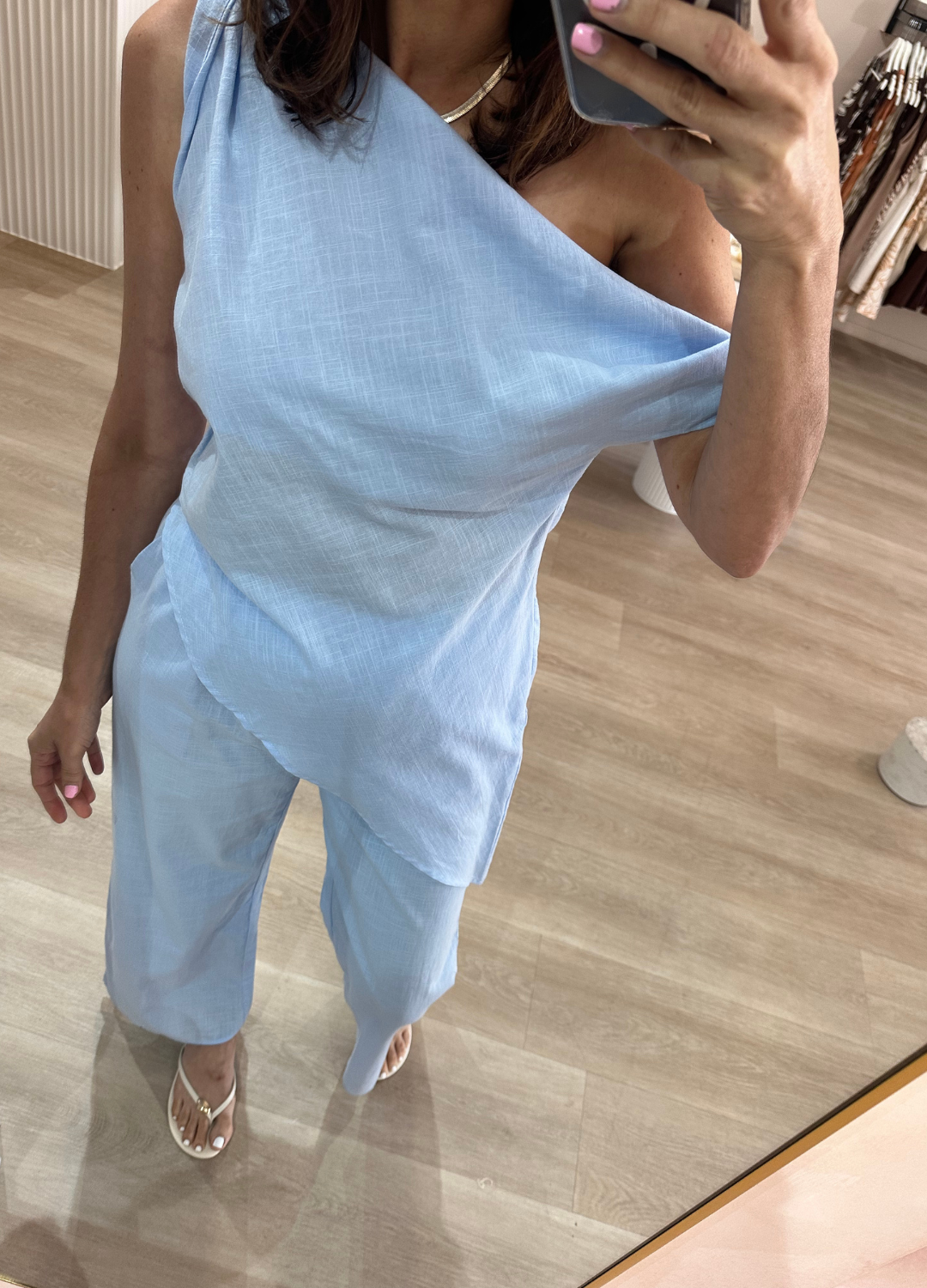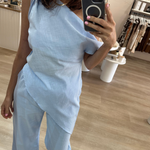 Effortlessly chic and ultra-comfortable, this baby blue set is the definition of relaxed luxury. Perfect for a casual day look or dressing up for a night out.