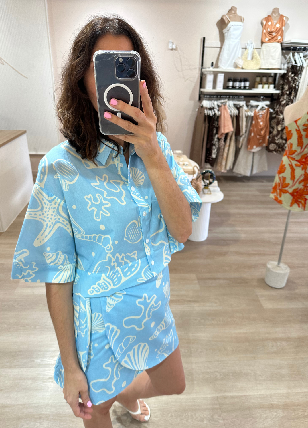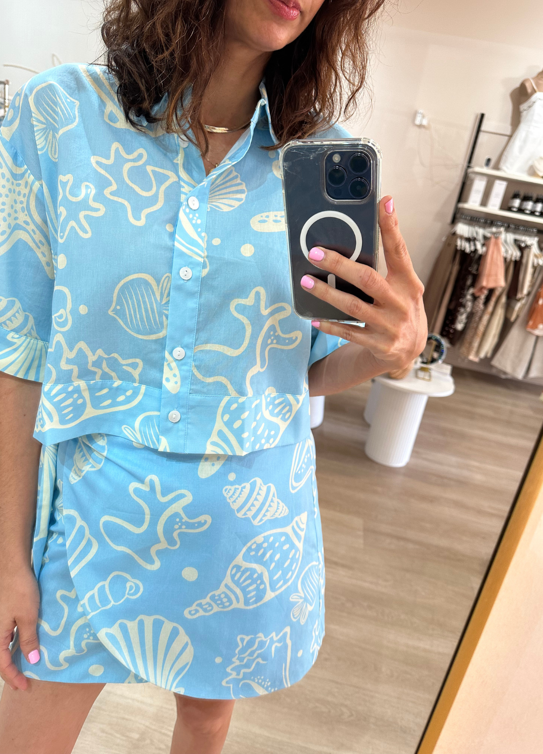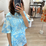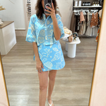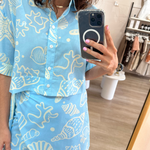 Dive into coastal charm with this blue and white beach set, featuring a breezy crop button-up shirt and a matching wrap skirt. The playful seashell and fish print brings a fresh ocean-inspired vibe, perfect for sunny getaways and seaside strolls. Crafted from lightweight, breathable fabric, this set offers effortless comfort and style.