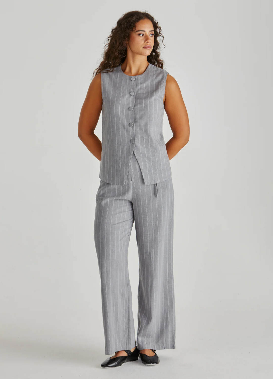 With its chic angled hem and self-fabric button details, this fitted vest is the ultimate layering piece. A round neckline keeps it classic, while the unlined design makes it light enough to wear year-round. Style it over a crisp shirt for a polished vibe or pair it with matching Petra pants for a playful set. Effortlessly cool and endlessly versatile!