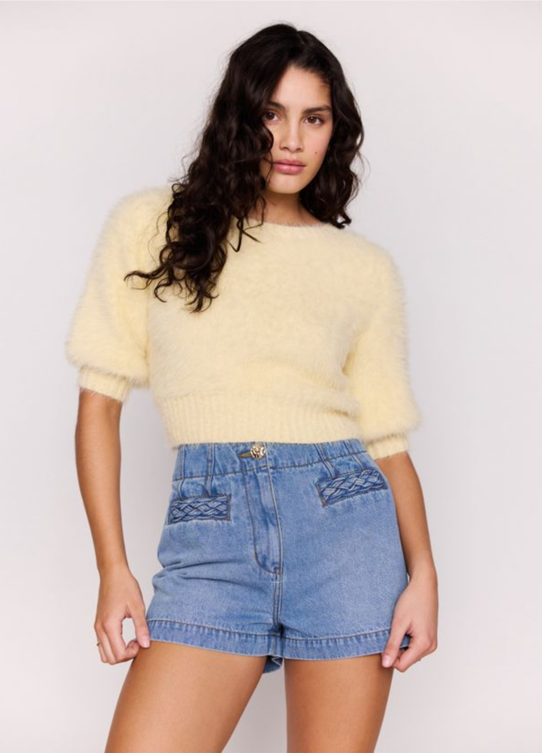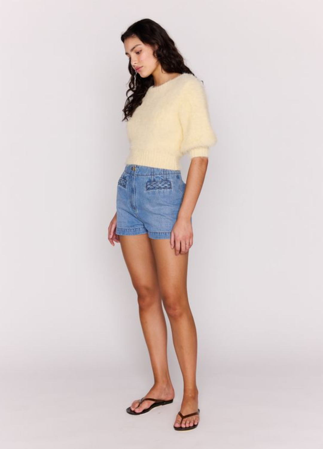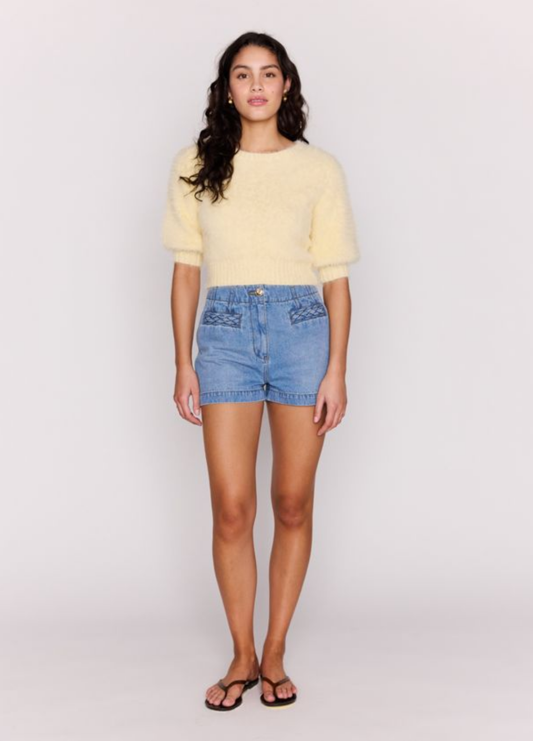 - Mid-rise denim shorts