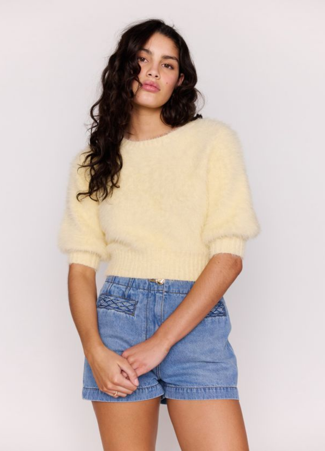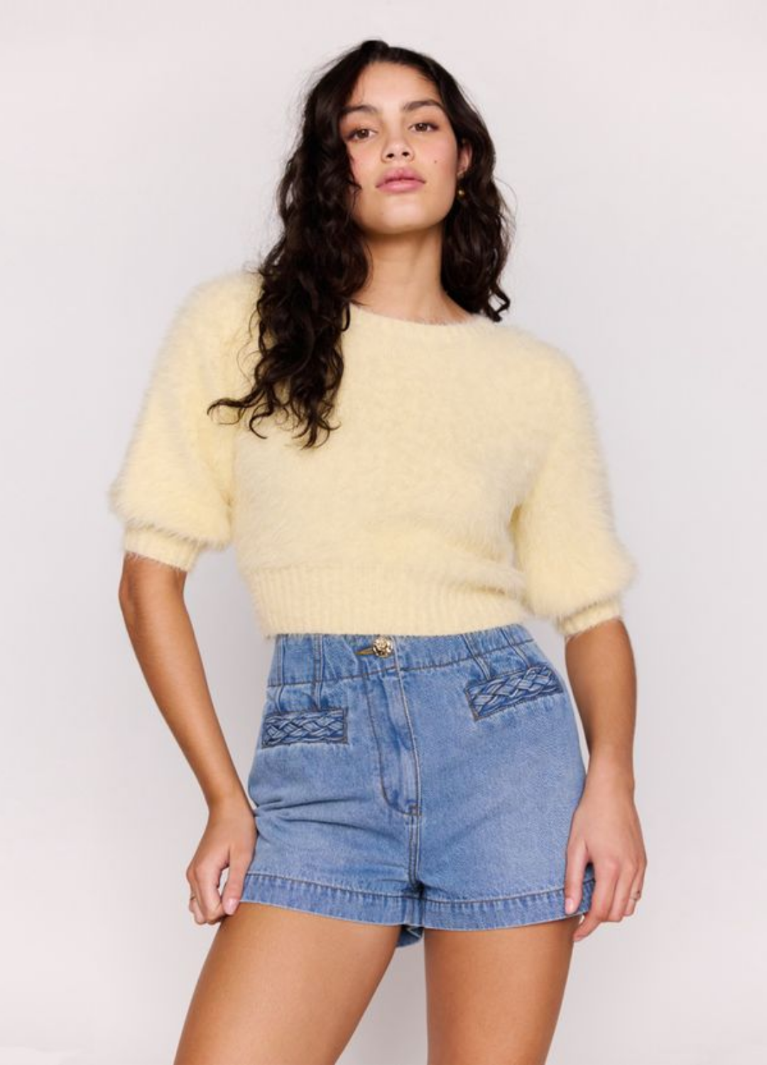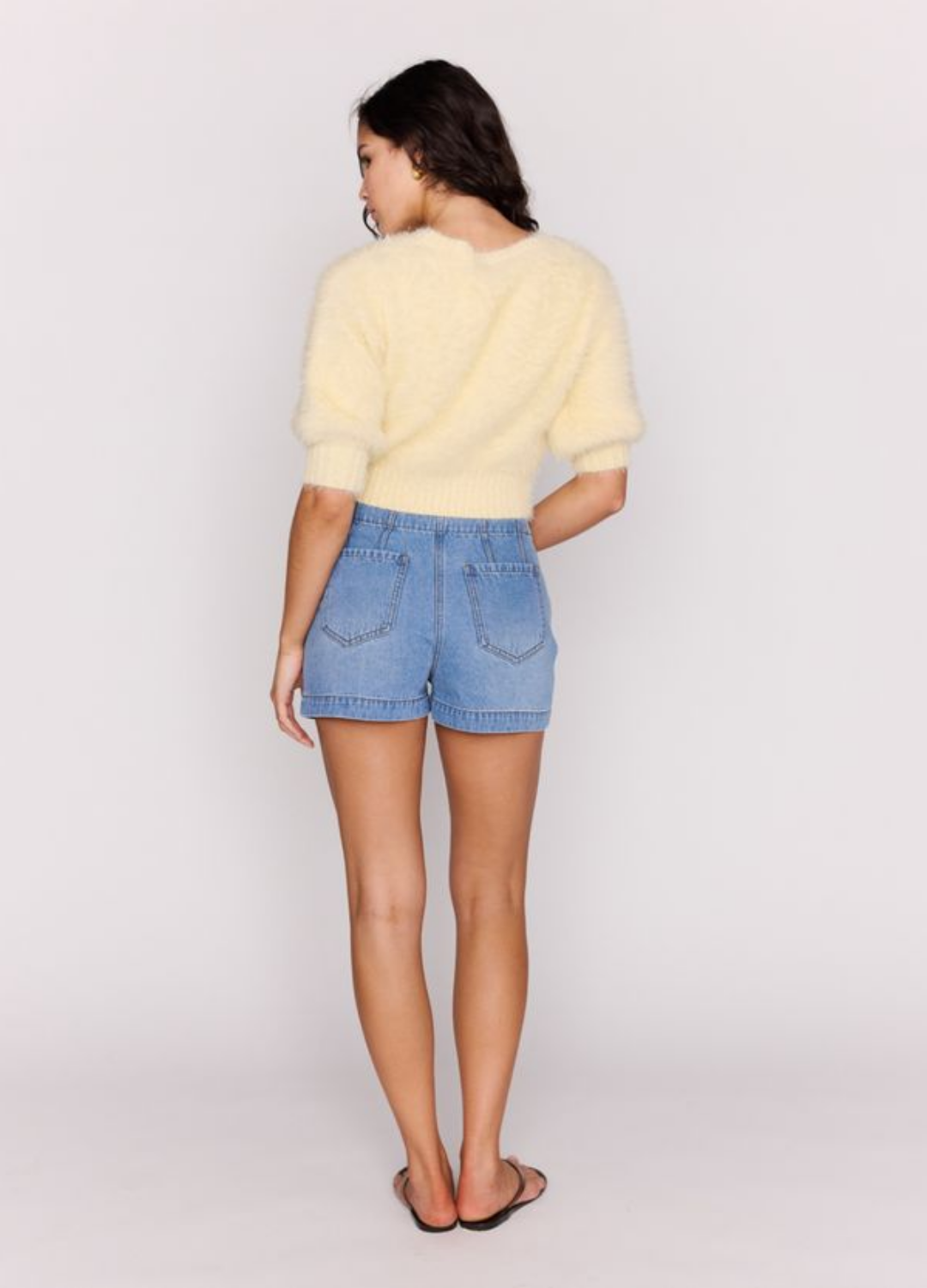 - Mid-rise denim shorts