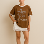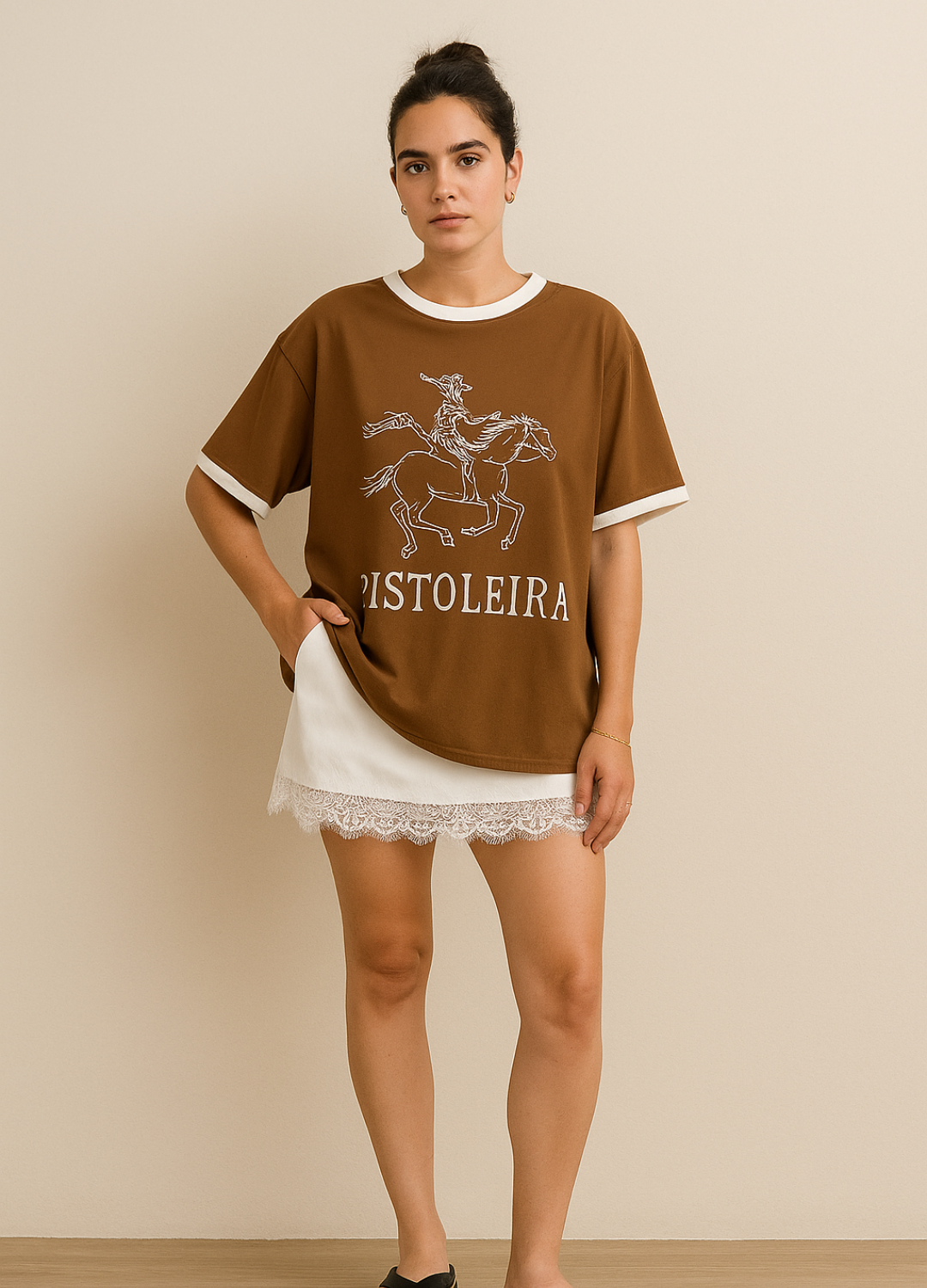 Ride into the sunset with the Pistolera set. This set captures a rebellious, Western-inspired aesthetic with its striking graphic, contrasting trim and beautiful silk and lace skirt.