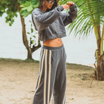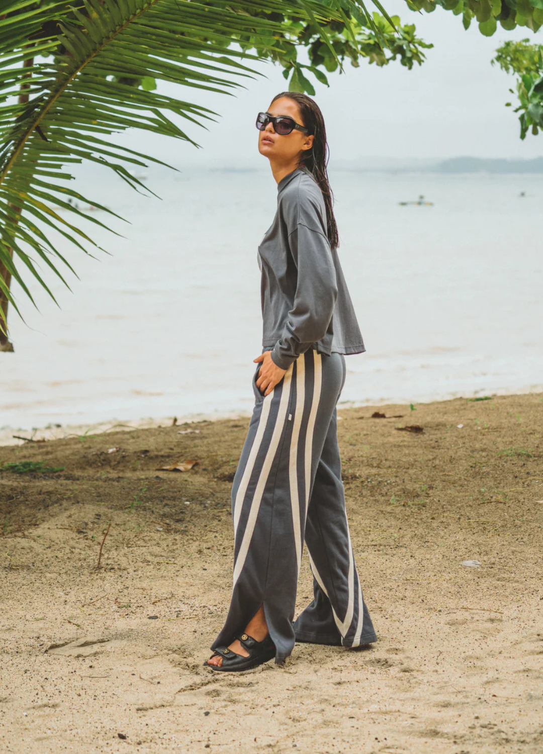 The Races Trackpant in Washed Black offers an effortless wide-leg silhouette made for everyday wear. Crafted from 100% premium cotton brushed fleece, this style features side pockets, contrasting velour trims that elongate the leg, and side split detail at the ankle. With an elasticised waistband, this trackpant is both flattering and comfortable. Pair yours with the Speedway Long Sleeve Tee in Maritime Blue, or the matching Daytona Long Sleeve Top in Washed Black a relaxed everyday look.