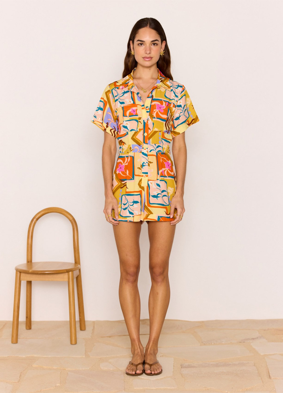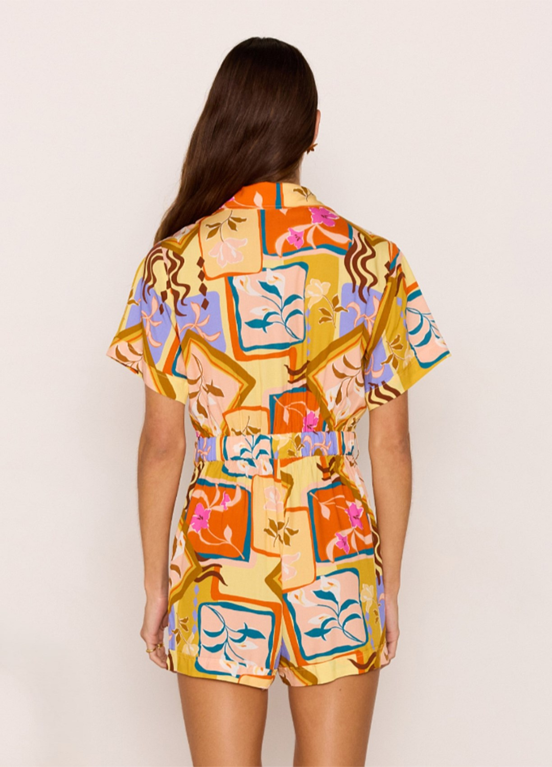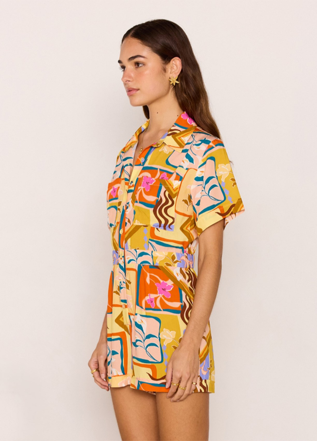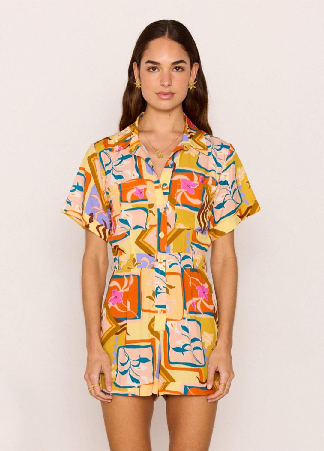 Bring a pop of colour to your wardrobe with the Rosin Playsuit, crafted from lightweight 100% viscose for effortless drape and comfort. Featuring a button-through front, short sleeves, and a flattering elasticated waist, this printed one-piece is designed to move with you from day to night. The bold geometric floral print in vibrant tones makes it the perfect statement look for summer styling.