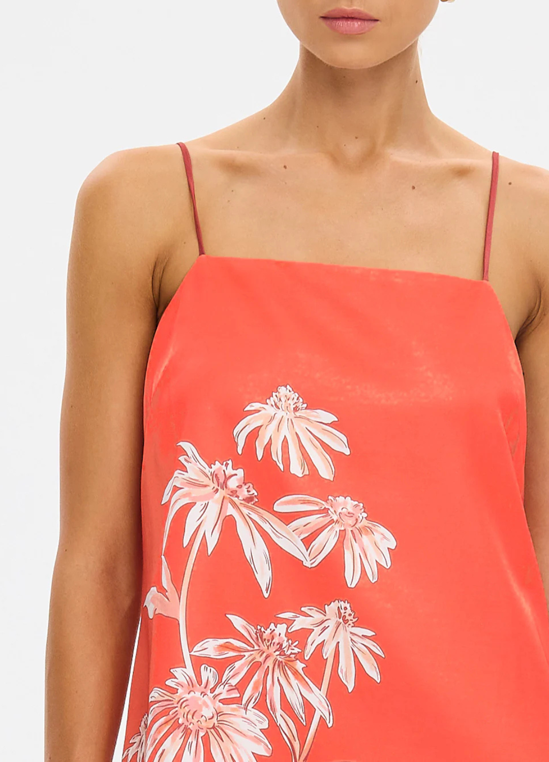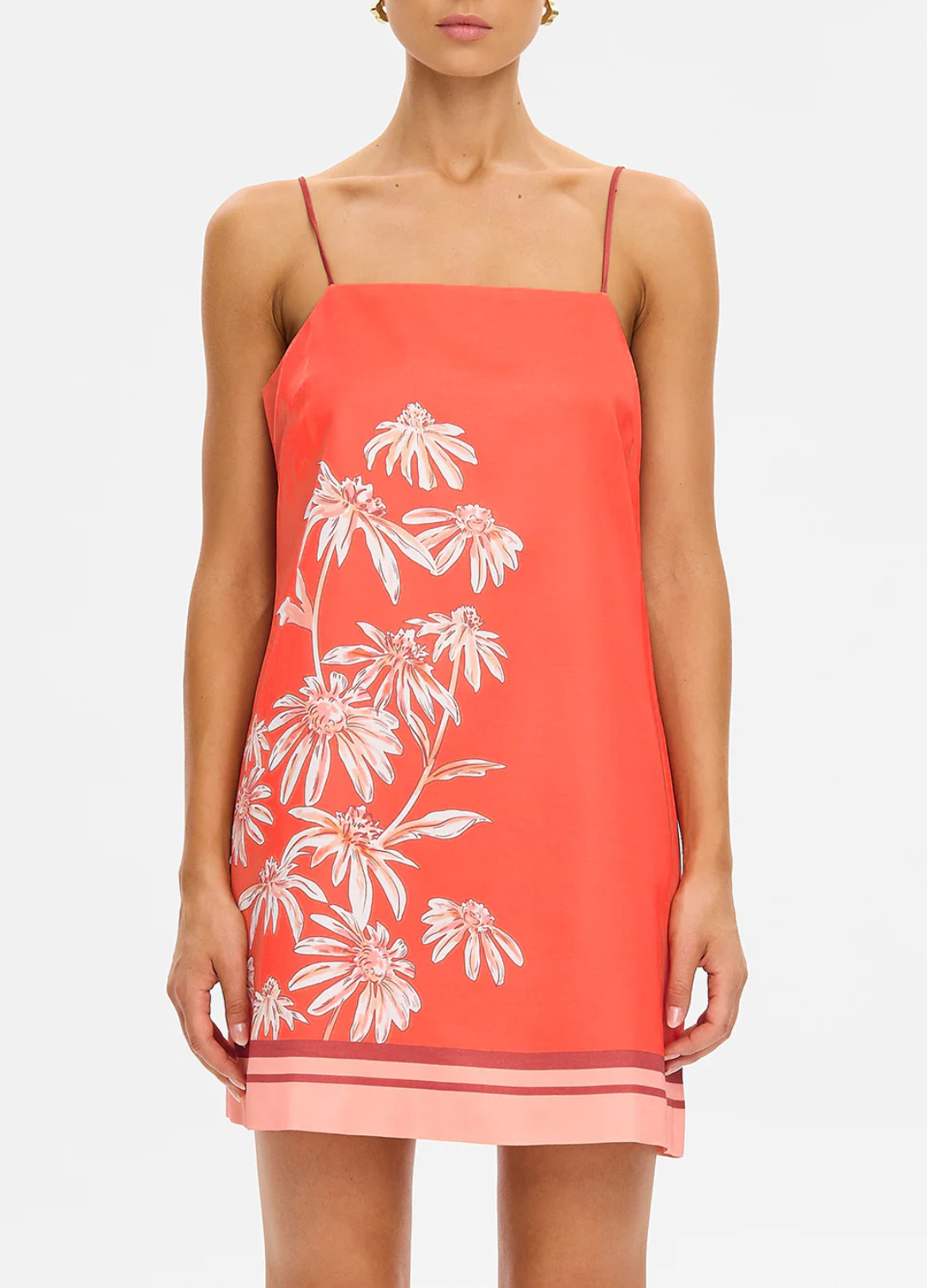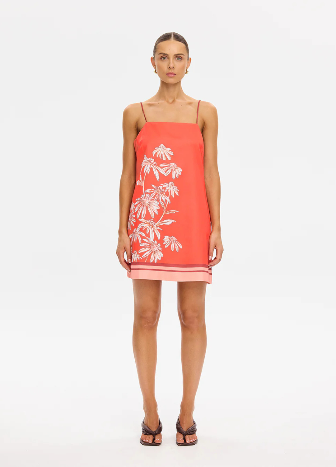 Ruby is soft ivory floral motifs on a vibrant coral base. The Ruby Mini Dress is a relaxed fit featuring a straight neckline with adjustable this straps, finished with a contrast printed hem for a subtle point of definition. Easy and effortless, it’s a timeless silhouette designed for warm-weather dressing. Perfect for long lunches, daytime celebrations or relaxed summer evenings.