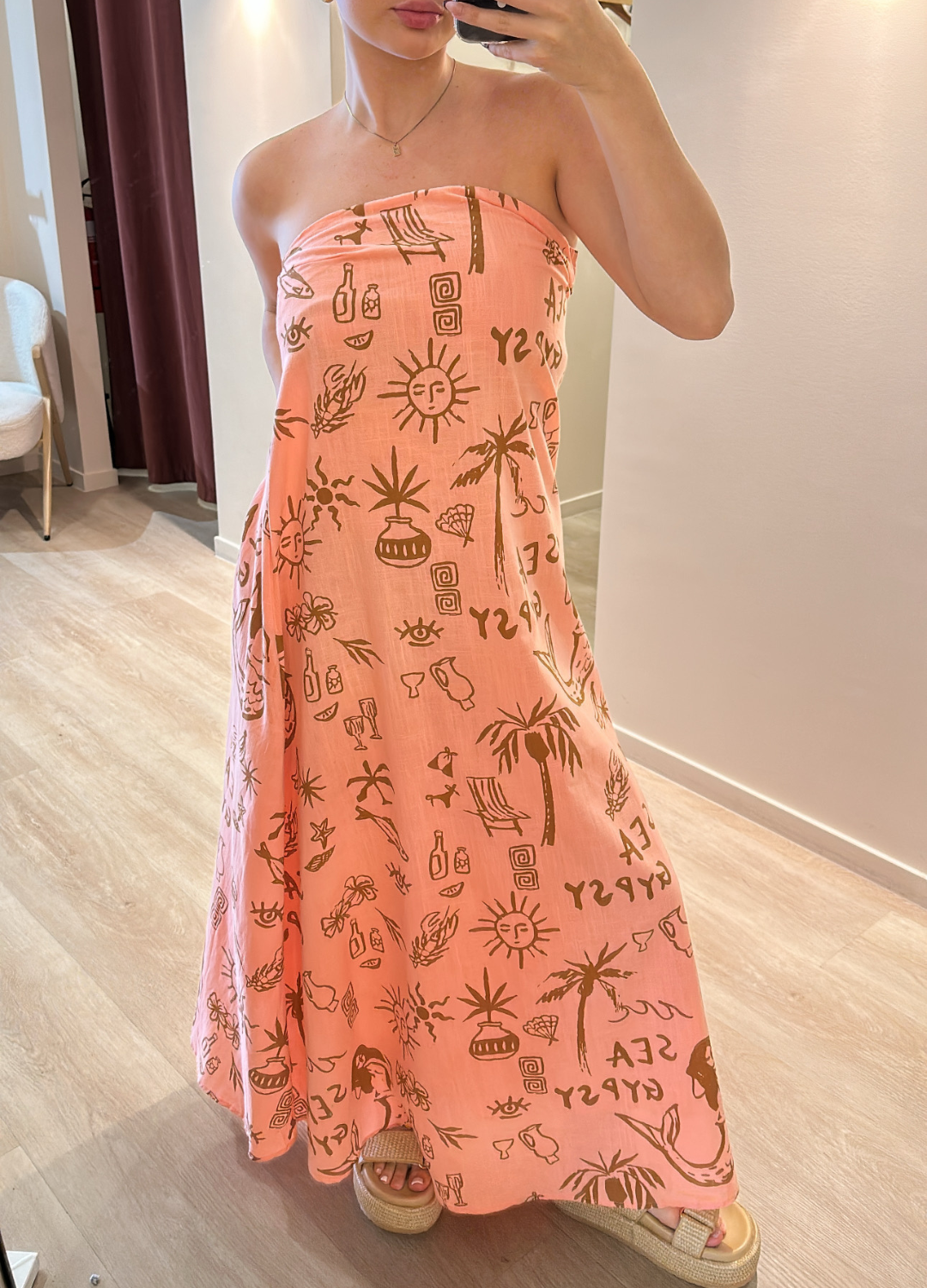 Step into effortless elegance with this strapless Peach maxi dress. The back features a gentle elastic for a secure, comfy fit, while the side zipper is hidden for a sleek finish. Fully lined for smooth wear, the dress is designed with subtle stay tape at the neckline to keep everything in place. Perfect for turning heads, it combines freedom of movement with refined style for any special occasion.