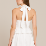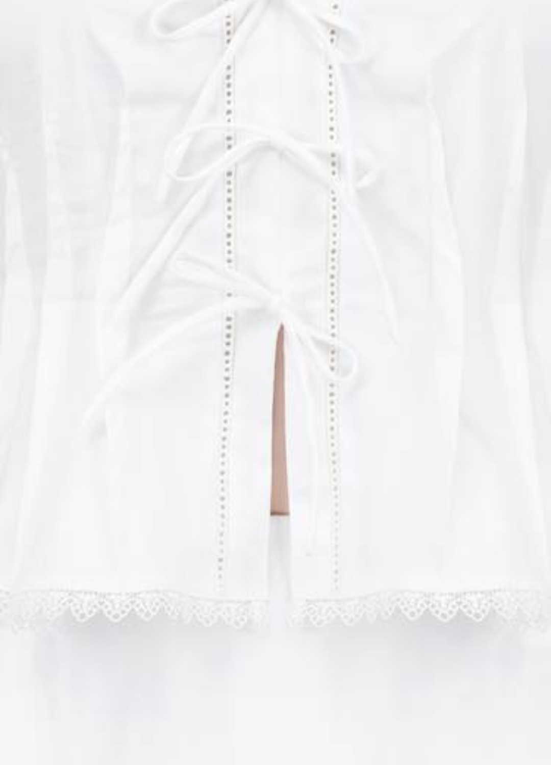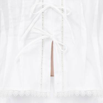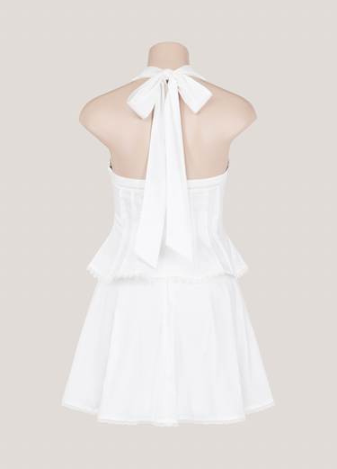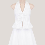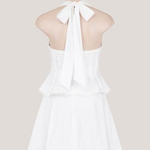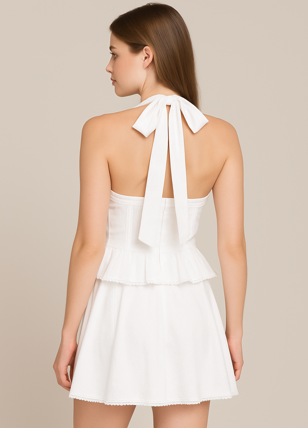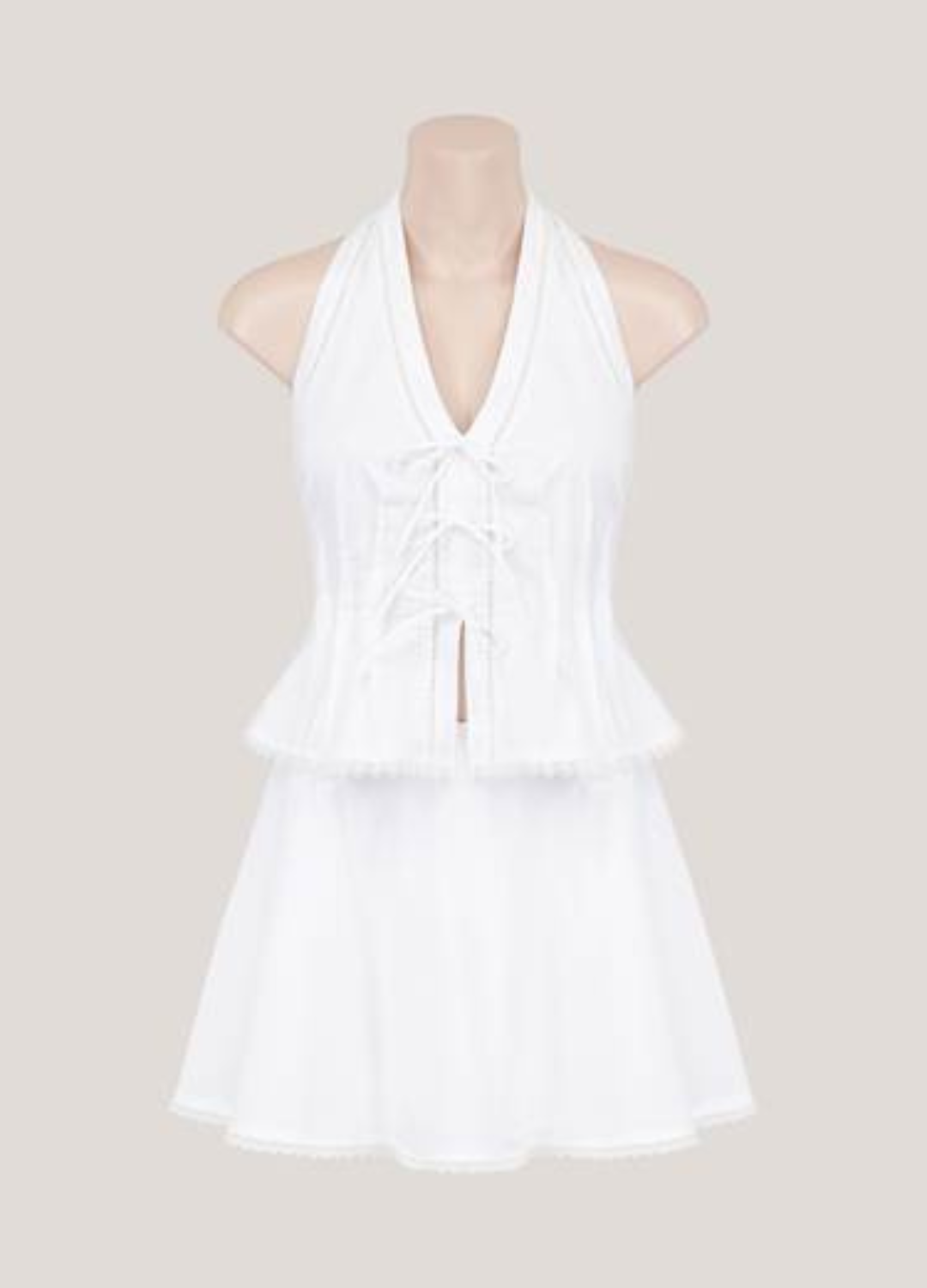 This white two-piece set features a chic halter-neck tie top paired with a matching skirt, finished with a delicate scallop lace hemline. Effortlessly feminine and stylish, it’s the perfect blend of simplicity and soft detail.