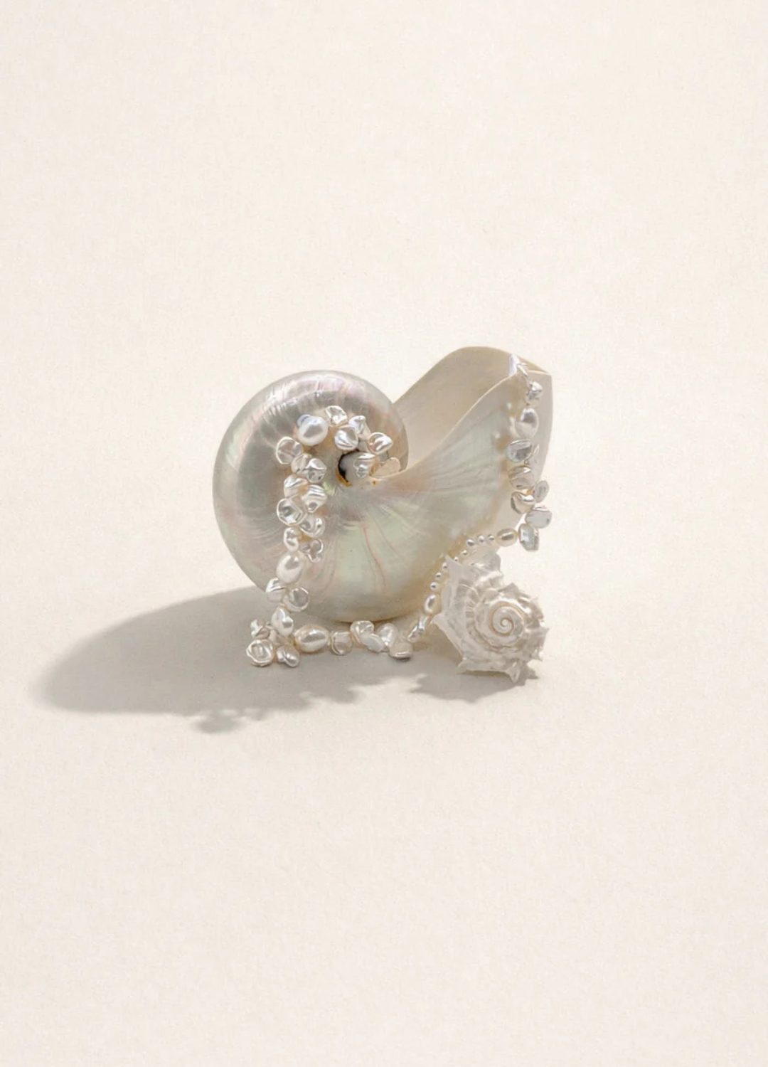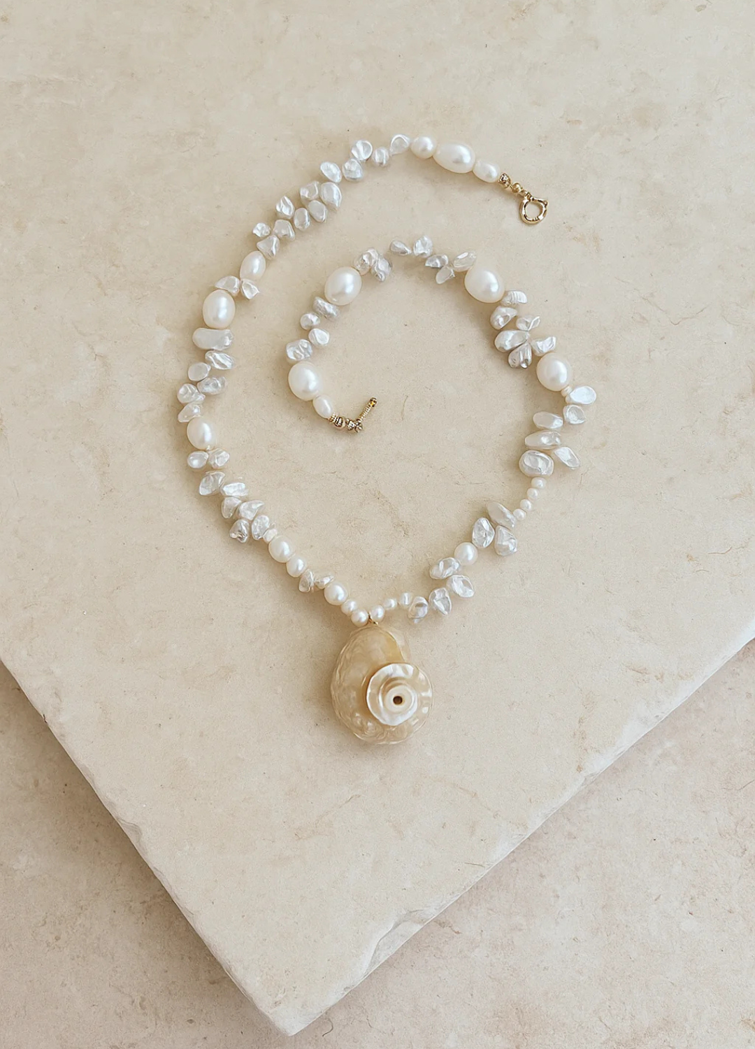 Each pendant forms naturally, its spiral recalling ocean-worn shells and weathered relics. The pearls shift in tone with the light, like water glinting over reef — no two ever the same.
