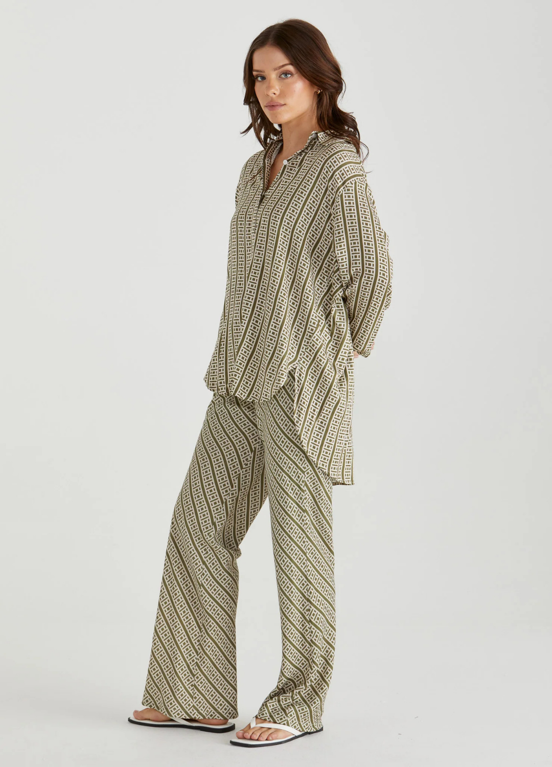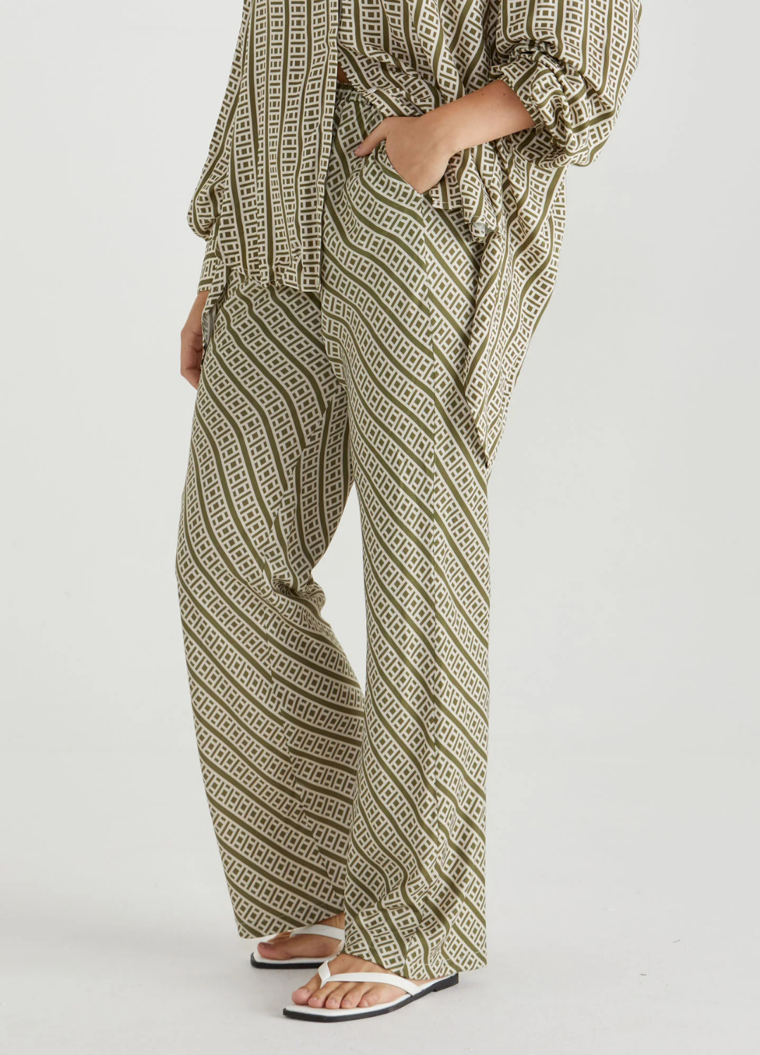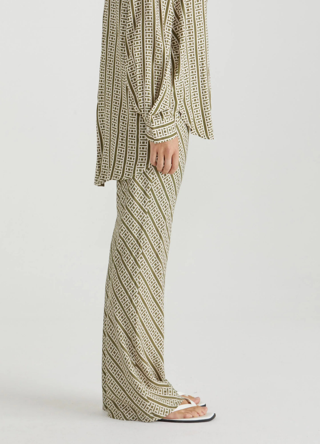 The Sullivan Bias Pant offers a modern twist on timeless elegance. Designed with a bias cut, flare leg profile, and an elasticated waistband with an adjustable tie, these pants pair perfectly with flowy tops or structured blazers for a chic look.