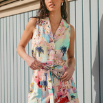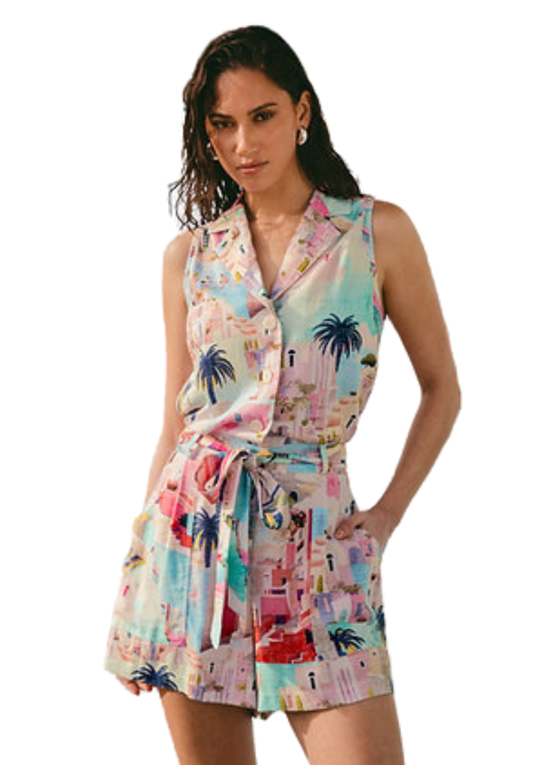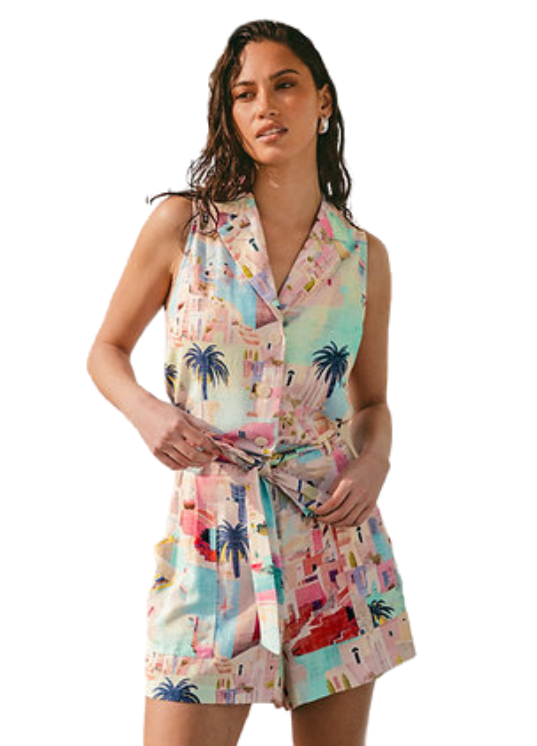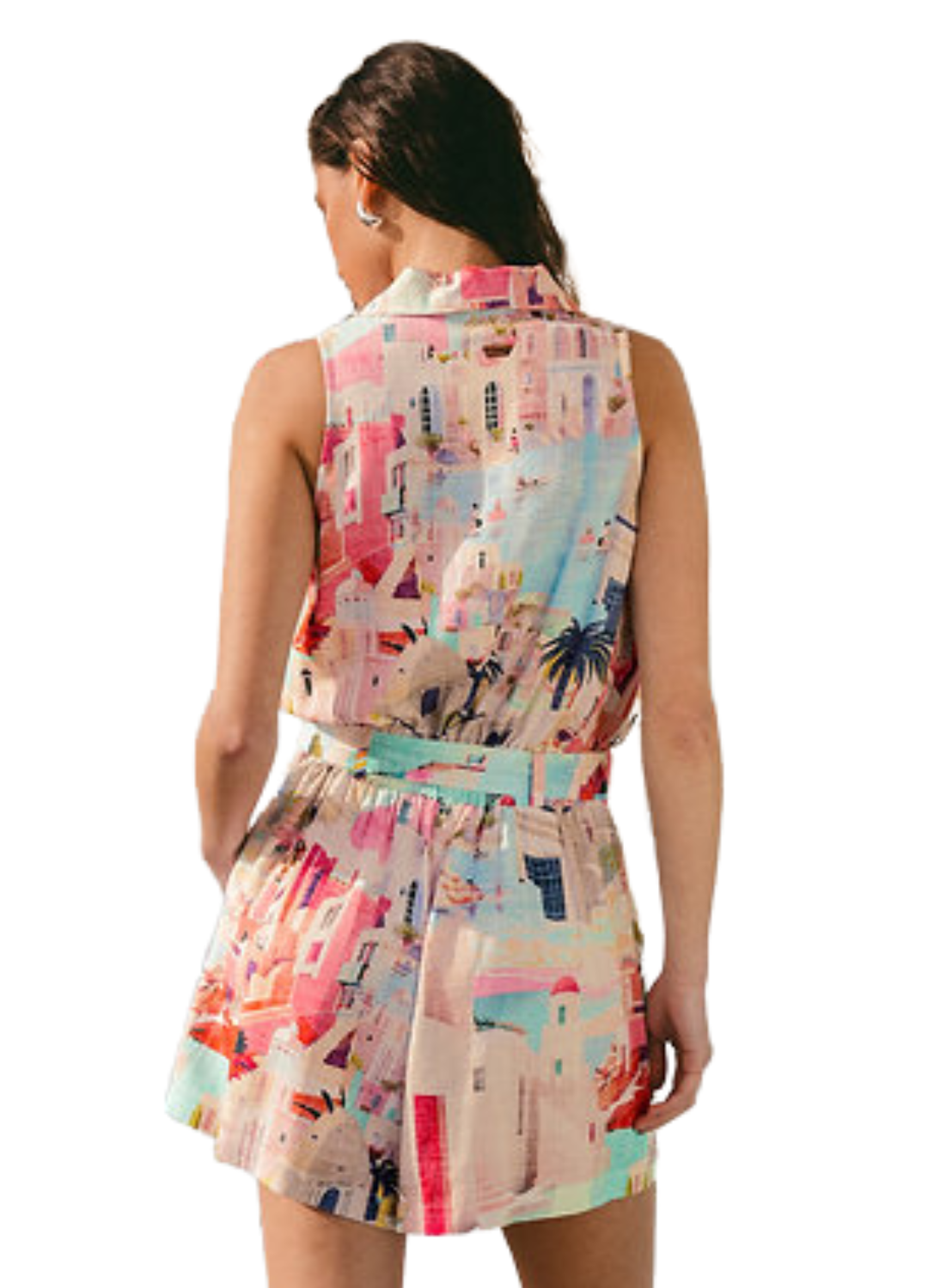 The Sunny Santorini Playsuit is crafted from a lightweight rayon-linen blend that keeps you cool while looking effortlessly stylish. Featuring a button-front top, zipper fly, and an adjustable waist tie for a flattering fit, this relaxed silhouette is perfect for summer strolls, beachside brunches, or sunset cocktails.