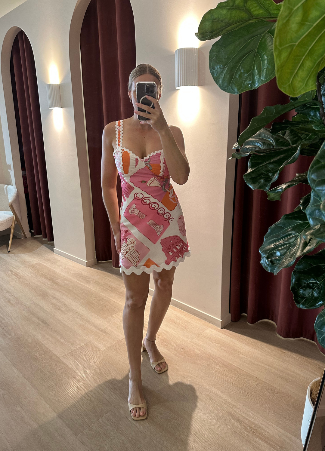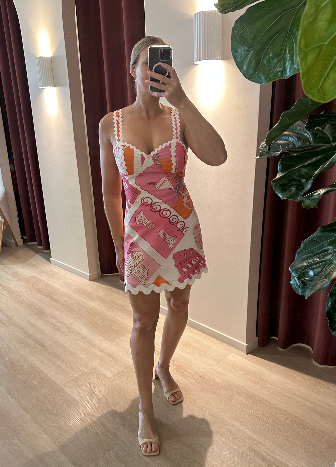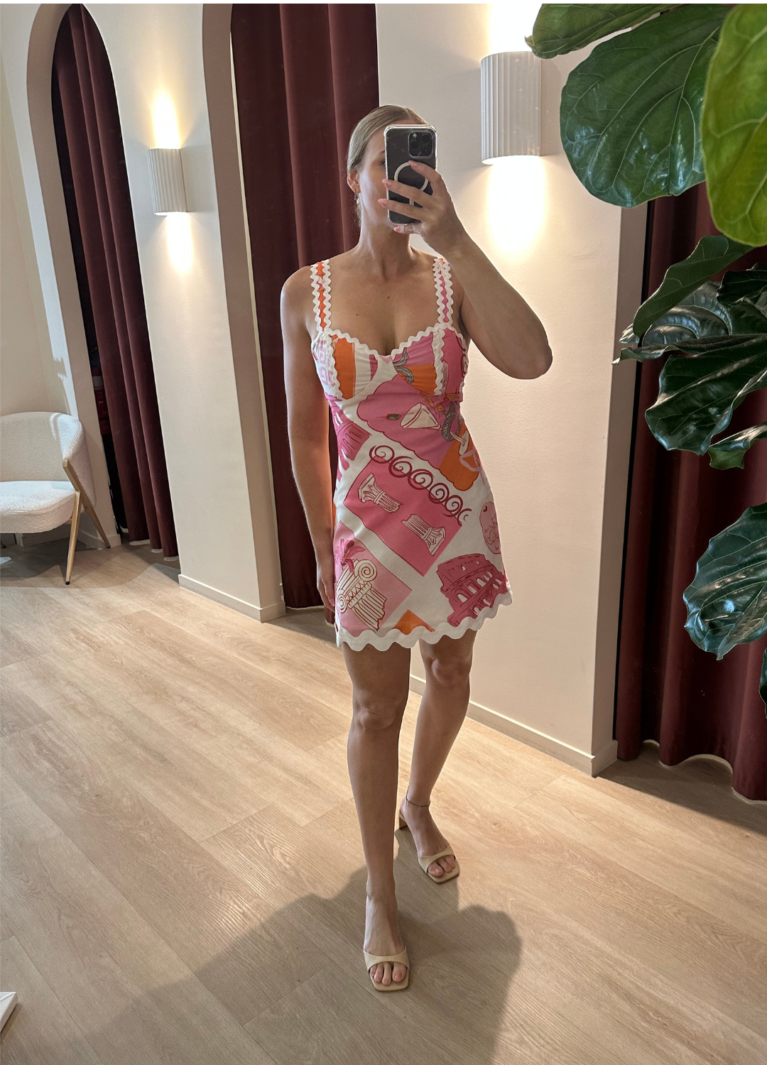 This dress is a playful, feminine mini dress with a soft, vintage-inspired feel. It features a square neckline with delicate white ric-rac trim along with the straps and neckline. The Trixie dress gives a romantic, retro European summer vibe, perfect for holidays, brunch or warm weather outings.