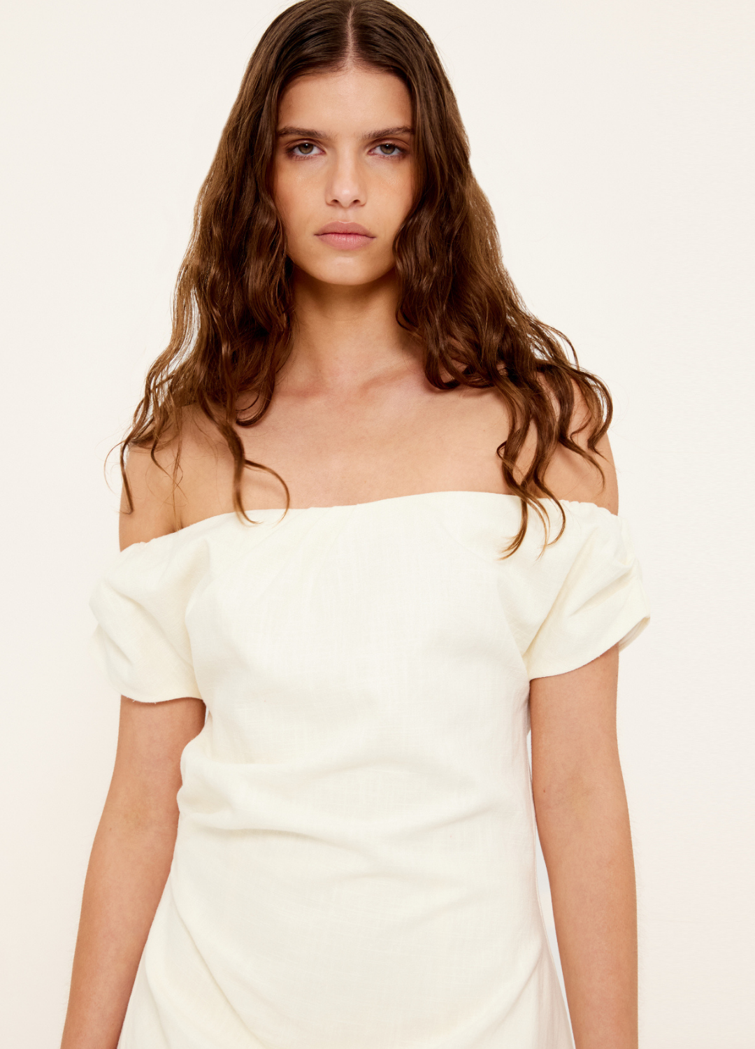 The Vera Off Shoulder Dress blends effortless femininity with timeless design. Crafted from a breathable linen-cotton blend, it features a flattering off-shoulder neckline, short sleeves, and a softly fitted silhouette perfect for any occasion.
