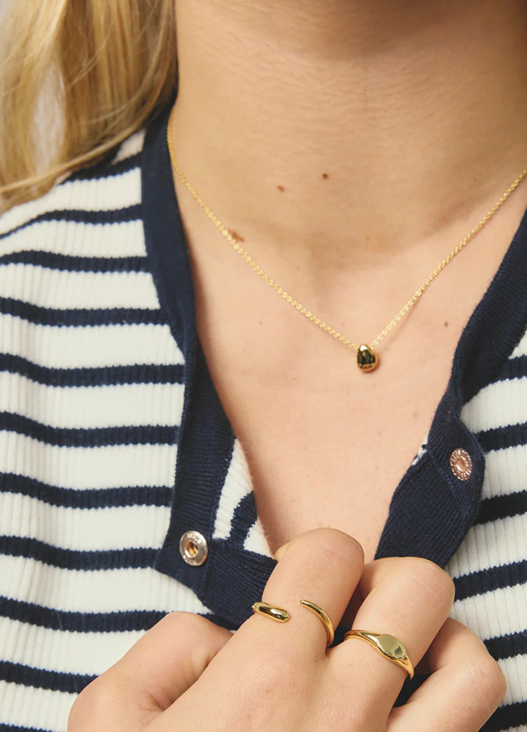 The Violet Necklace features a natural teardrop-shaped pendant. When paired with gold chains, this necklace creates a fashionable and attention-grabbing accent for your ensemble.