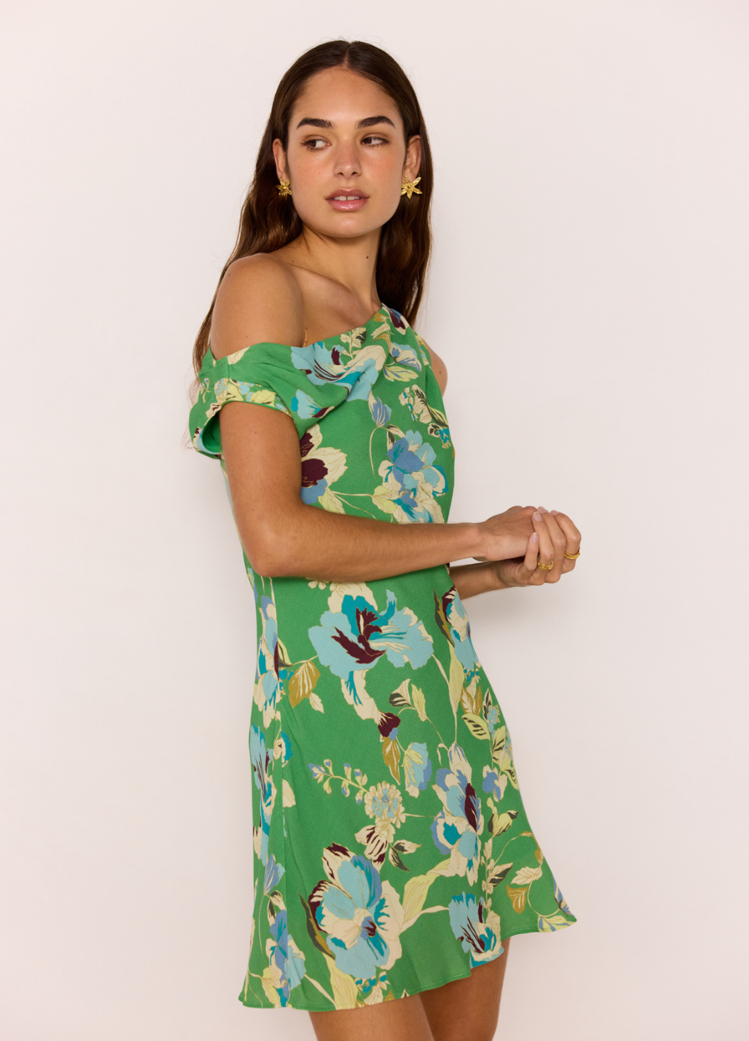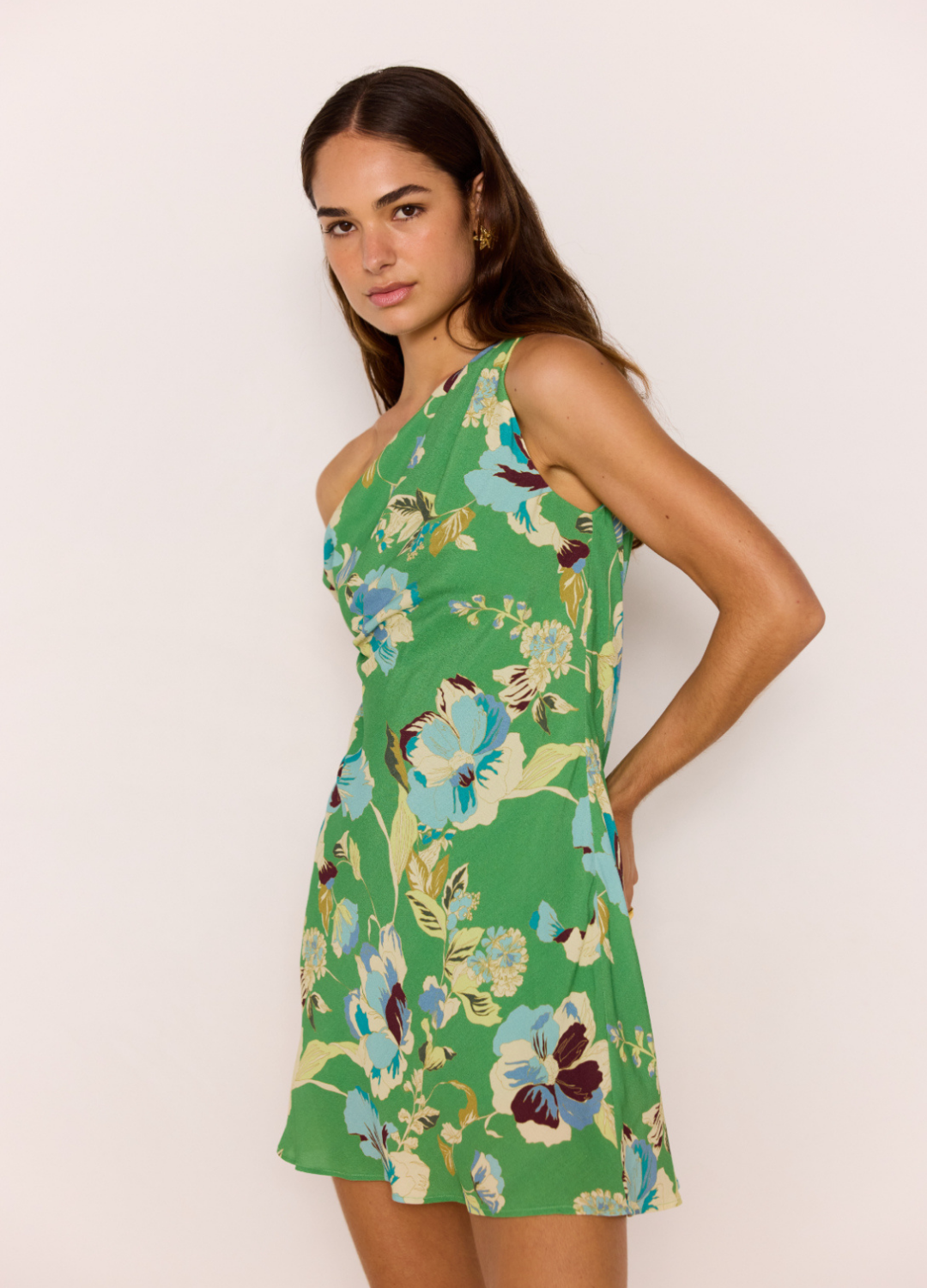 Playful, flattering, and full of colour - the Zoe Bias Mini Dress is your go-to for summer days and nights. Designed in a fresh green floral print, this one-shoulder mini features a softly draped neckline and bias-cut silhouette that skims the body perfectly. Crafted from 100% viscose, it feels lightweight and breezy with a soft, silky lining for added comfort.